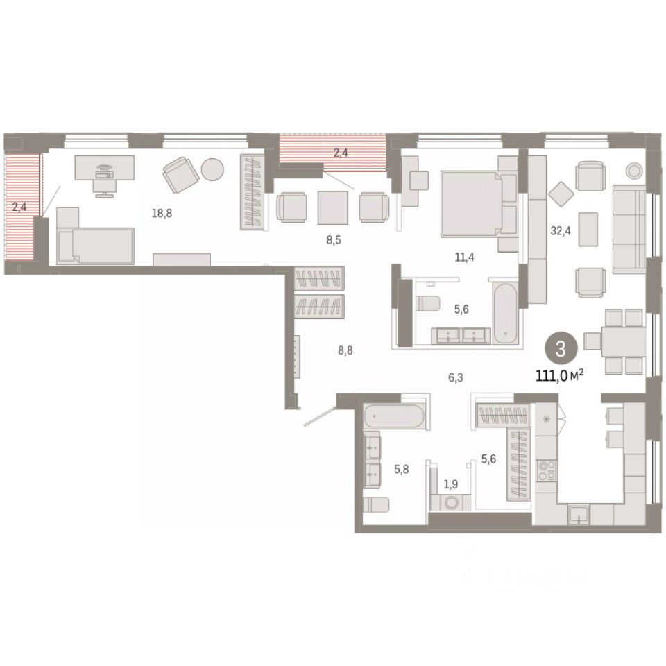 Квартира с кухней-гостиной и тремя спальнями в Октябрьском на Туре. Особенности планировки: вид на реку, лоджия, мастер-спальня, постирочная, предчистовая отделка. квартиры в нашей базе: ОКТ-08-6-6.11.8.