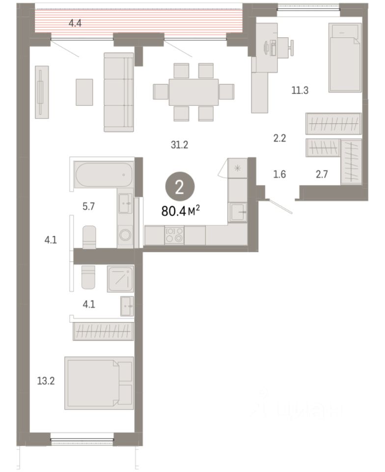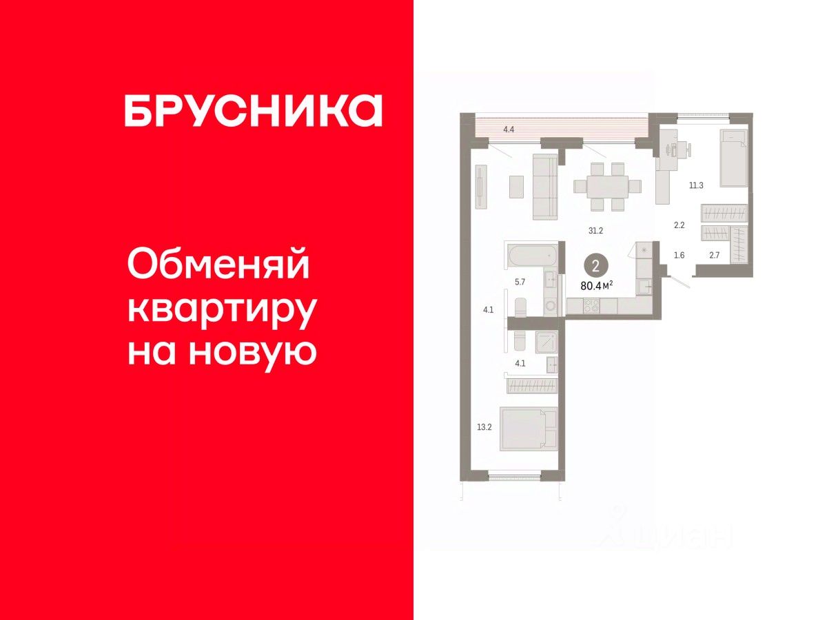 Квартира с кухней-гостиной и двумя спальнями в Октябрьском на Туре. Особенности планировки: вид во двор, второй санузел, мастер-спальня, предчистовая отделка, разнесённые спальни, терраса на крыше. квартиры в нашей базе: ОКТ-10-6-6.7.2.