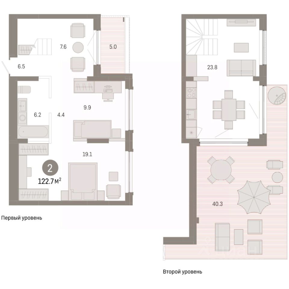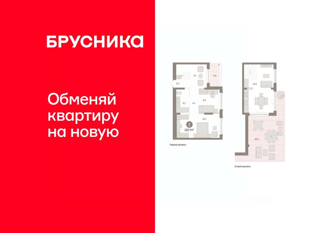 Двухуровневая квартира с кухней-гостиной и двумя спальнями в Октябрьском на Туре. Особенности планировки: двухуровневая, мастер-спальня, предчистовая отделка, терраса на крыше. квартиры в нашей базе: ОКТ-10-4-4.8.3.