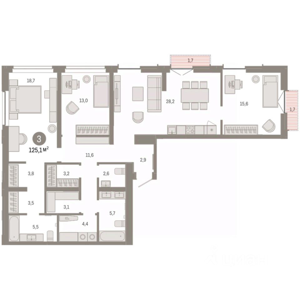 3-комн. квартира с предчистовой отделкой в ЖК ''Республики 205'' на 10 этаже. Общая площадь: 125.11 кв.м., жилая: 47.3 кв.м., площадь просторной кухни-гостиной: 28.2 кв.м. Квартира угловая, очень светлая, естественная вентиляция при открытии окон. В квартире два балкона, два совмещенных и один раздельный санузел. Высота потолков 2.7 м.