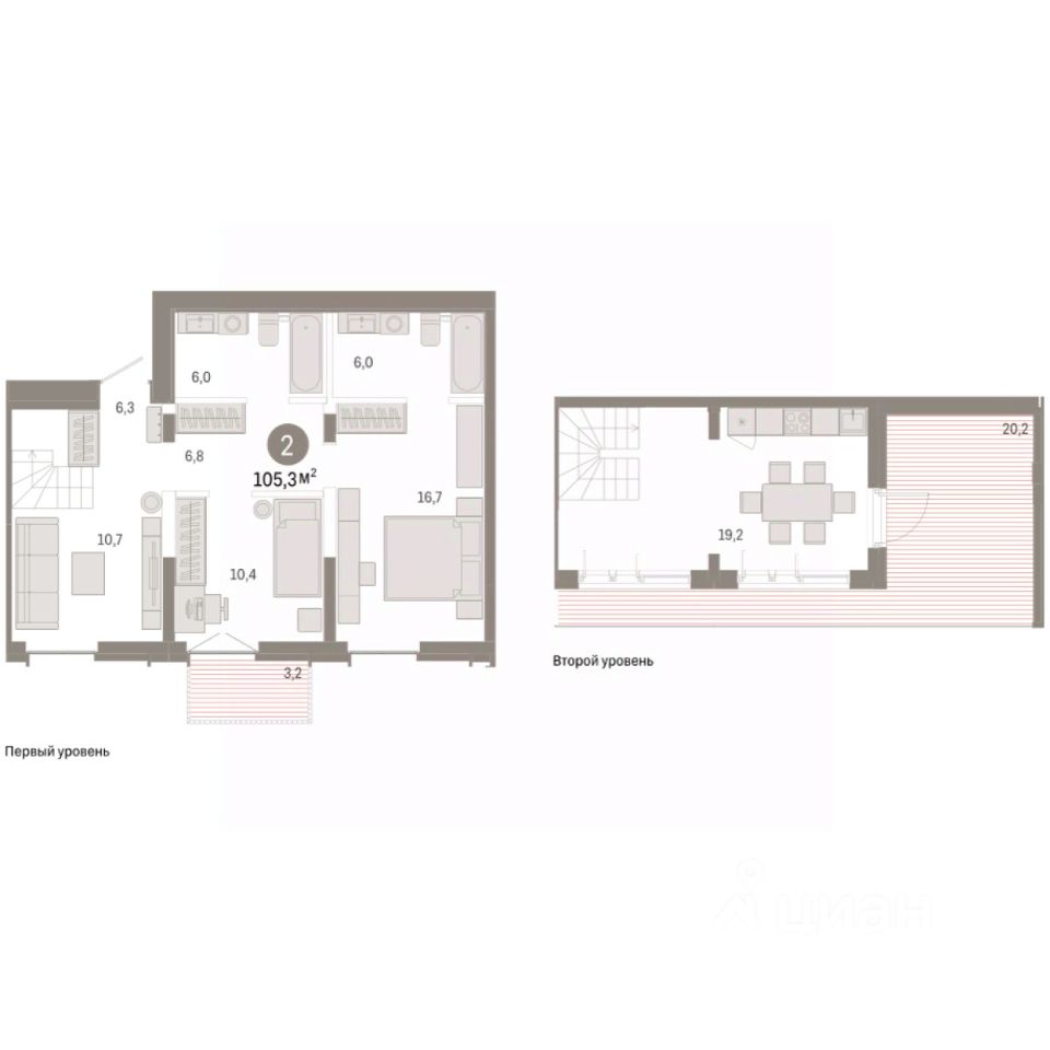 Двухкомнатная квартира с предчистовой отделкой в ЖК ''Республики 205'' на 8 этаже. Общая площадь: 105.32 кв.м. Высота потолков 2.7 м.