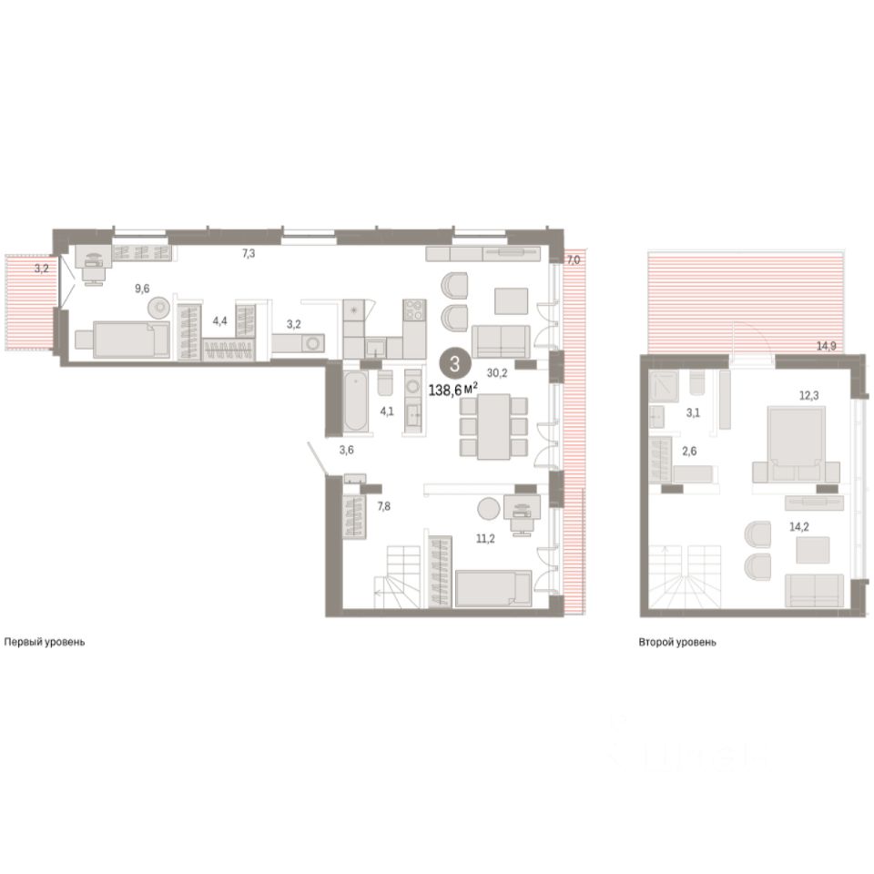3-комн. квартира с предчистовой отделкой в ЖК ''Республики 205'' на 7 этаже. Общая площадь: 138.59 кв.м. Высота потолков 2.7 м.