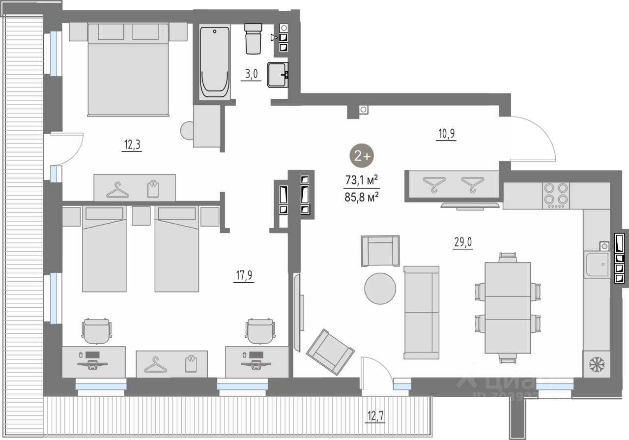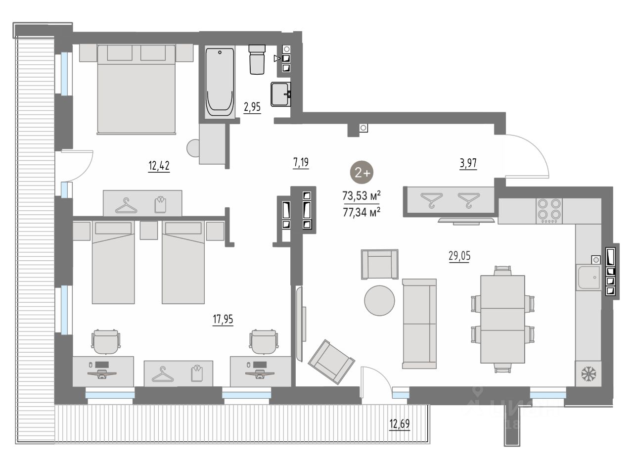 В квартирах: панорамные окна высотой от 2,4 м.