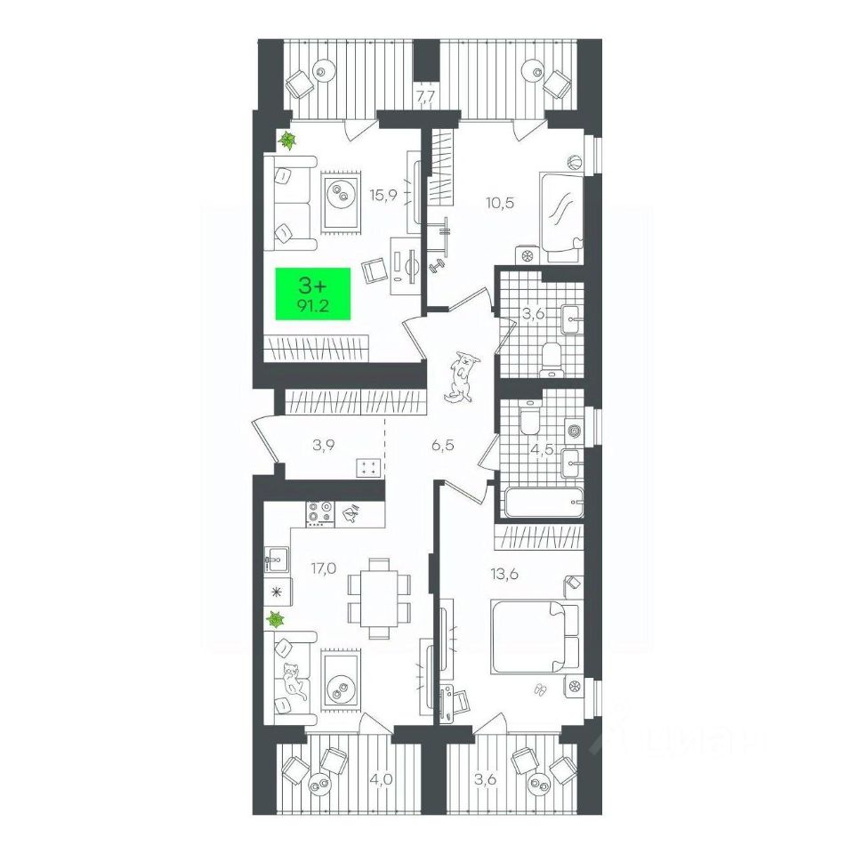 Продаётся 3-комнатная квартира в строящемся доме (Д5.2 (Малкова, 5)), срок сдачи: III-кв. 2026, общей площадью 91.25 кв.м., на 11 этаже. Компания 4D приступила к строительству нового жилого комплекса ''Гранд квартал''. Новый ЖК находится в зеленой зоне Калининского района, южнее микрорайона Тюменская слобода.