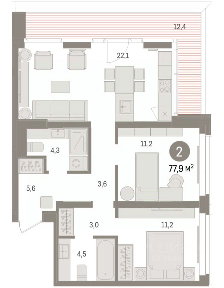 Квартира с кухней-гостиной и двумя спальнями в кварталах ''На Минской''. Особенности планировки: предчистовая отделка. квартиры в нашей базе: МНС01-Ж1.3.8.