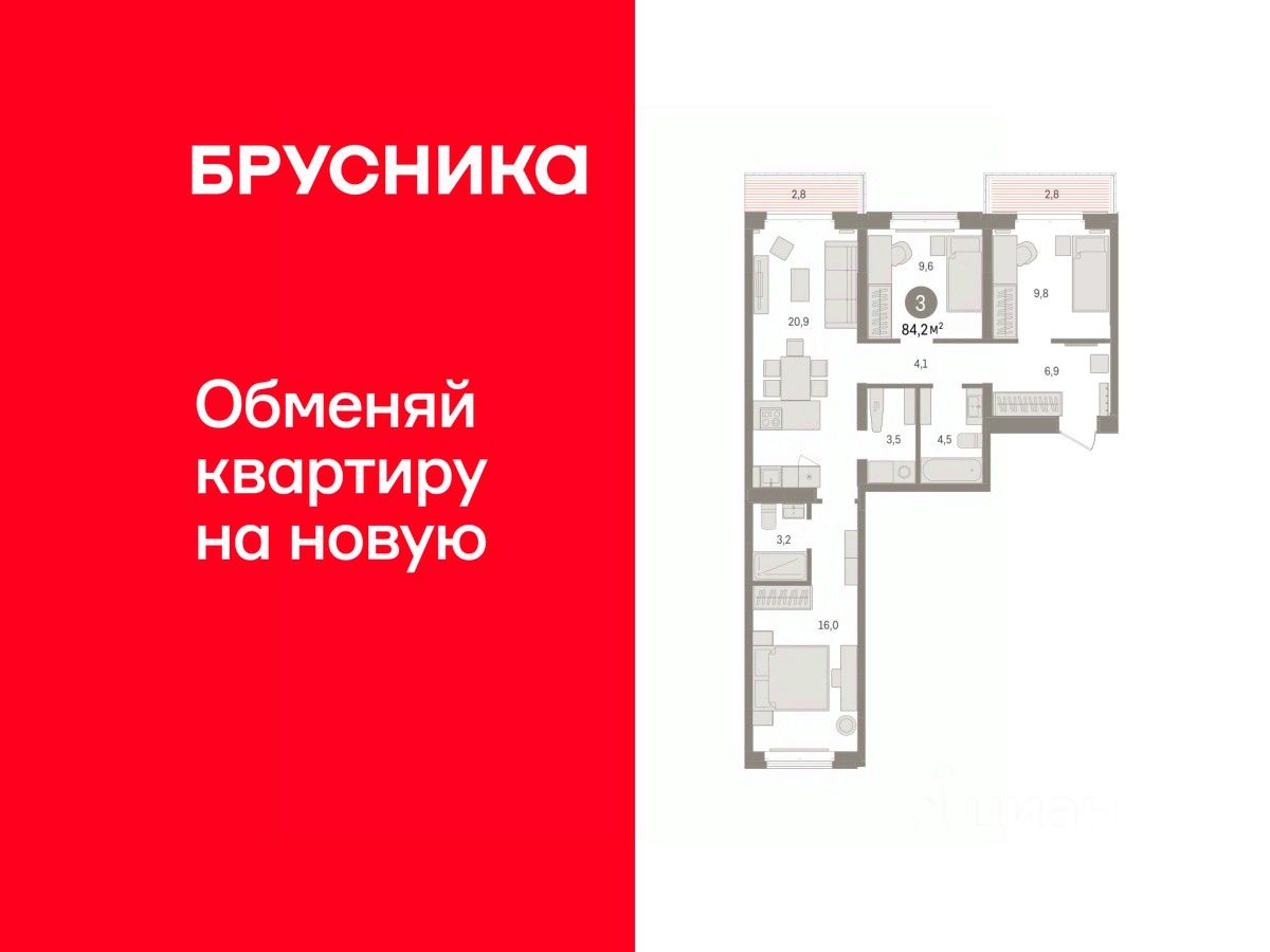 Квартира с кухней-гостиной и тремя спальнями в кварталах ''На Минской''. Особенности планировки: балкон, предчистовая отделка, разнесённые спальни. квартиры в нашей базе: МНС01-Ж4.5.5.