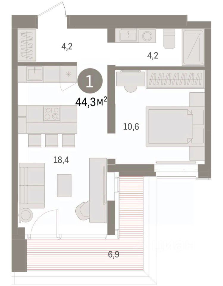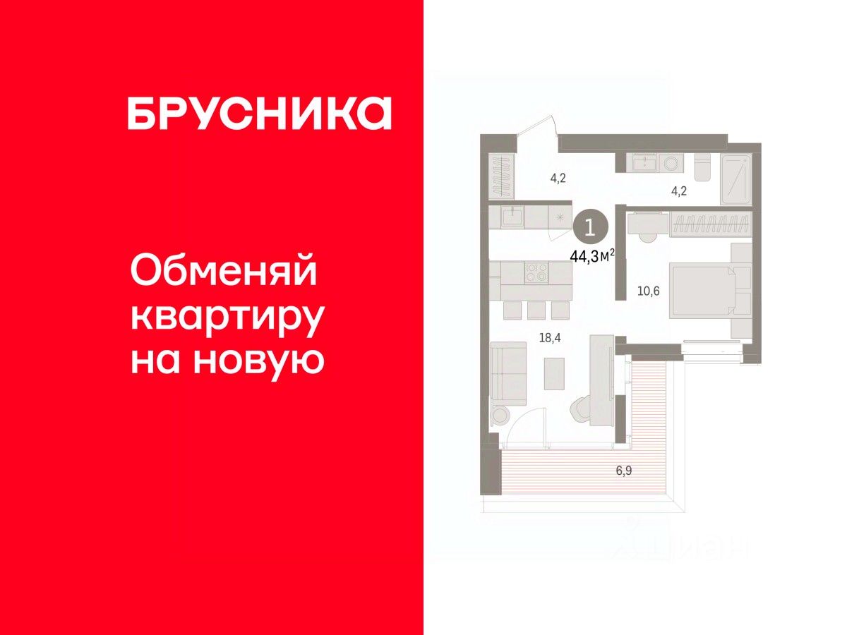Квартира с кухней-гостиной и одной спальней в кварталах ''На Минской''. Особенности планировки: предчистовая отделка. квартиры в нашей базе: МНС01-Ж1.12.2.