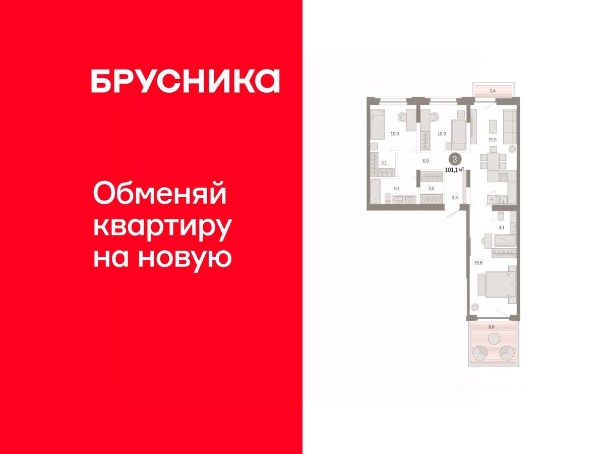 Квартира с кухней-гостиной и тремя спальнями в жилом районе ''Зарека''. Особенности планировки: разнесённые спальни, свободная планировка. квартиры в нашей базе: ЗРК05.2-Ж2.2.2.