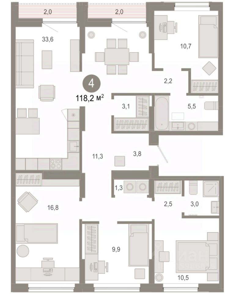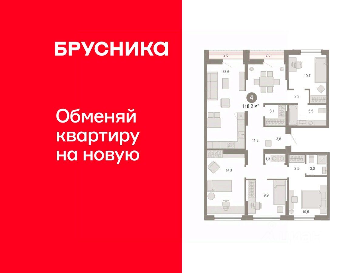 Квартира с кухней-гостиной и четырьмя спальнями в Октябрьском на Туре. Особенности планировки: вид во двор, гардеробная, лоджия, мастер-спальня, постирочная, предчистовая отделка, разнесённые спальни. квартиры в нашей базе: ОКТ09-Ж2.7.1.