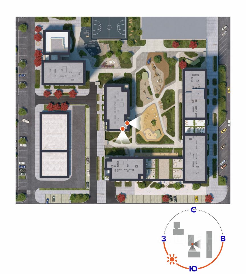 Благоустроенная территория дворы без машин, детские и спортивные площадки, зоны отдыха, велодорожки и озеленение.