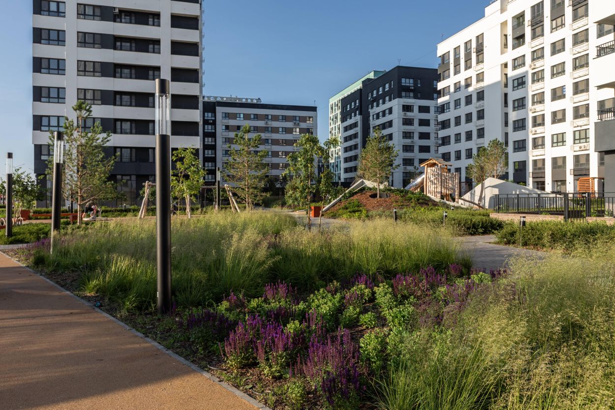 Квартал в Комарово Парк — шесть домов переменной этажности и два наземных паркинга, которые формируют уютную квартальную застройку, органично вписываясь в природное окружение. Здесь можно наслаждаться тишиной, сохраняя доступность городской инфраструктуры. Комарово Парк — это новый район города с собственной инфраструктурой, расположенный в черте города и в то же время рядом с природой.