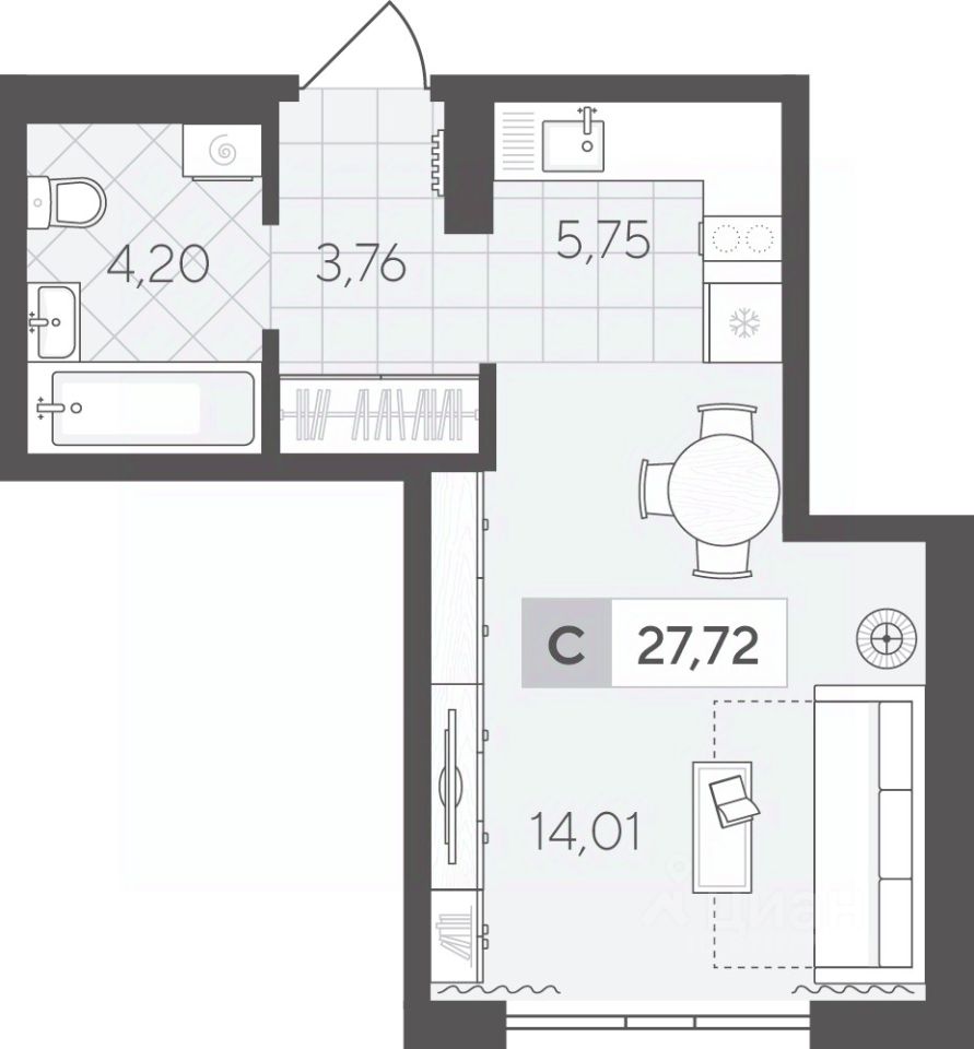 Студия площадью 27.72 кв.м на 3 этаже — хороший вариант для первой квартиры. Функциональная планировка позволит легко зонировать пространство и отделить зону готовки, гостиную и спальню.