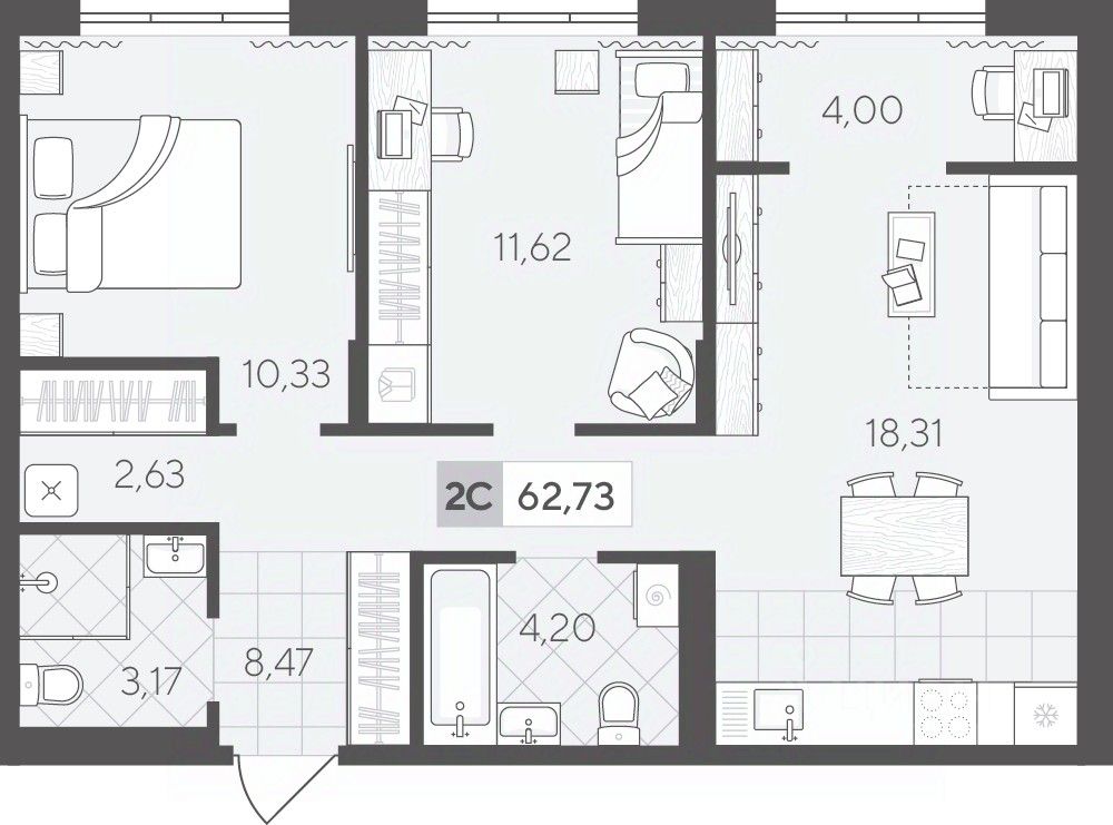 Двухкомнатная квартира 62.73 кв.м на 4 этаже — идеальный вариант для молодой семьи или пары. Просторная кухня-гостиная станет местом семейных встреч, а две спальни обеспечат удобство и приватность для каждого.