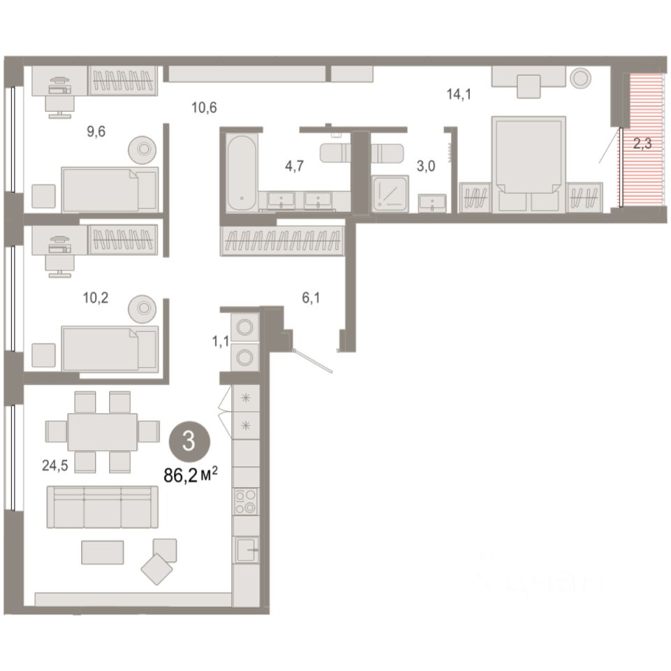 Квартира с кухней-гостиной и тремя спальнями в Октябрьском на Туре. Особенности планировки: предчистовая отделка, разнесённые спальни. квартиры в нашей базе: ОКТ09-Ж5.5.1.