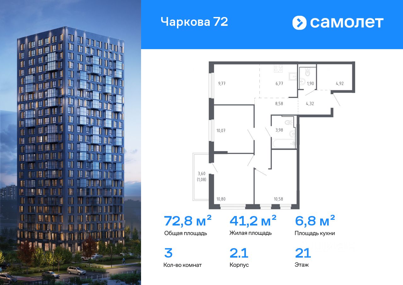 Строим кварталы для жизни с заботой о будущем. Предлагается 3-комнатная квартира комфорт-класса 72,77 кв.м в корпусе 2.1 на 21 этаже, в ЖК ''Чаркова 72'' Квартира с чистовой отделкой. Доступность дополнительных опций уточняйте у застройщика.