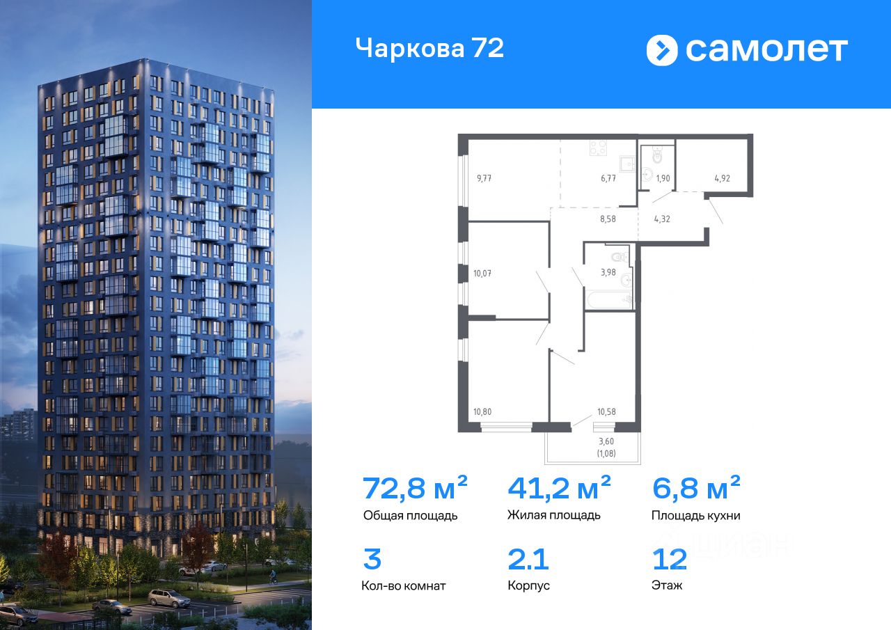 Строим кварталы для жизни с заботой о будущем. Предлагается 3-комнатная квартира комфорт-класса 72,77 кв.м в корпусе 2.1 на 12 этаже, в ЖК ''Чаркова 72'' Квартира с чистовой отделкой. Доступность дополнительных опций уточняйте у застройщика.