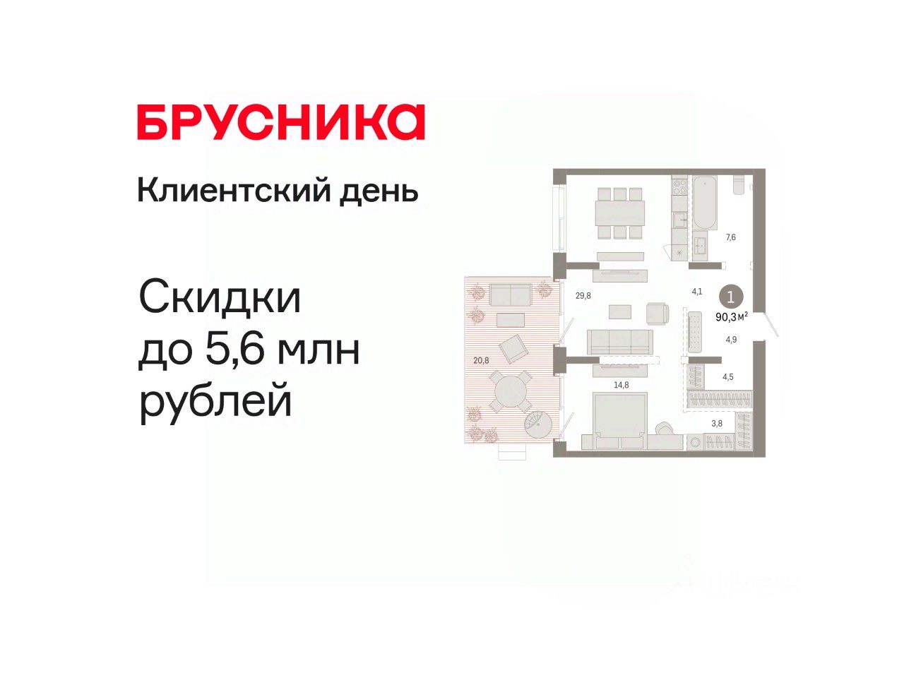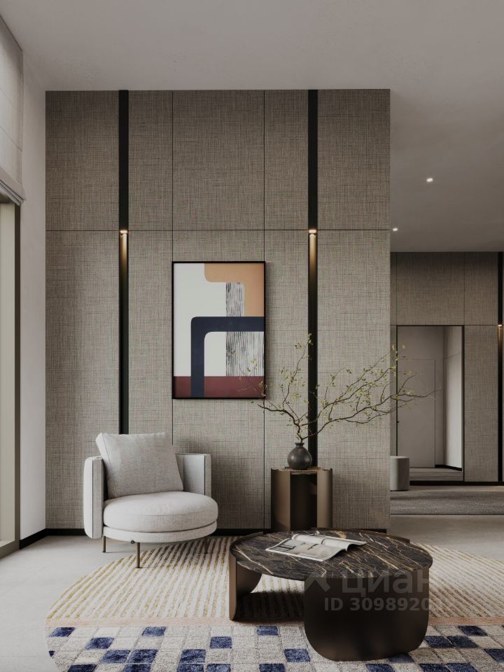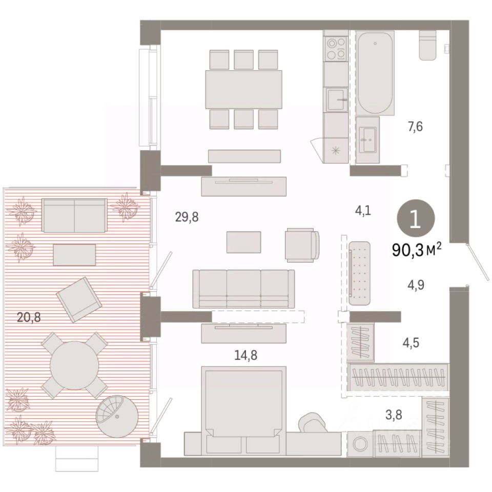 Квартира с кухней-гостиной и одной спальней в кварталах ''На Минской''. Особенности планировки: вид во двор, гардеробная, окна в пол, панорамное остекление, предчистовая отделка, терраса. квартиры в нашей базе: МНС02-Ж5.2.3.
