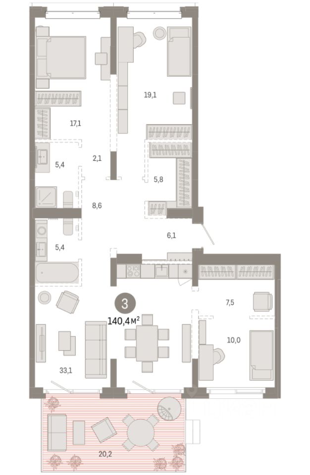 Квартира с кухней-гостиной и тремя спальнями в кварталах ''На Минской''. Особенности планировки: вид во двор, второй санузел, гардеробная, окна в пол, окна на две стороны, панорамное остекление, потолки 3 м и выше, предчистовая отделка, разнесённые спальни, терраса. квартиры в нашей базе: МНС02-Ж10.2.1.