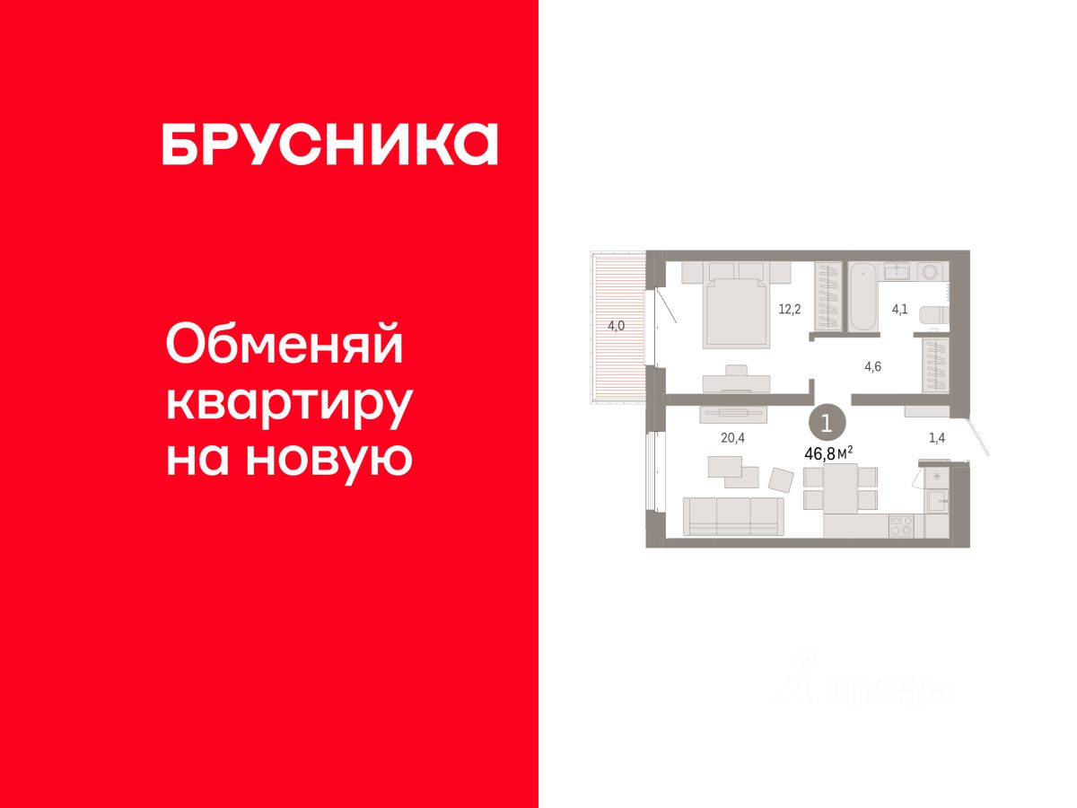Квартира с кухней-гостиной и одной спальней в кварталах ''На Минской''. Особенности планировки: балкон, предчистовая отделка. квартиры в нашей базе: МНС02-Ж8.4.5.