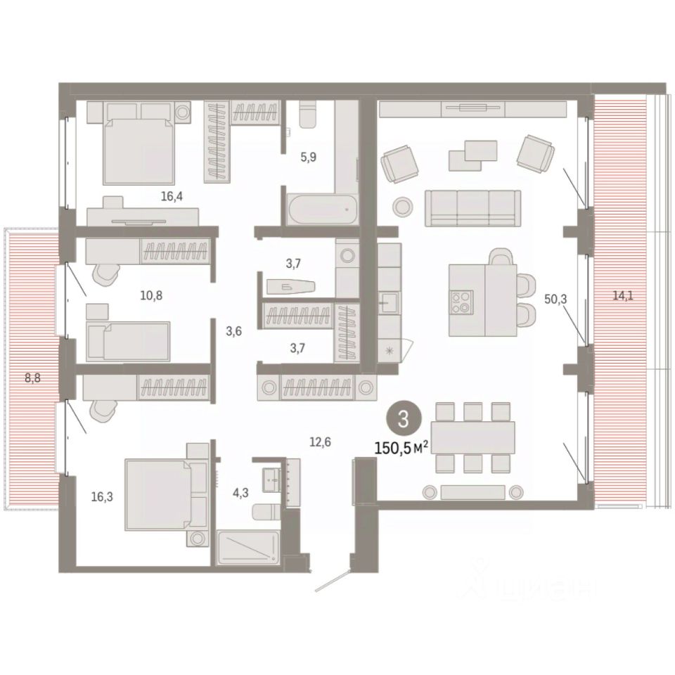 Квартира с кухней-гостиной и тремя спальнями в кварталах ''На Минской''. Особенности планировки: балкон, предчистовая отделка, терраса на крыше. квартиры в нашей базе: МНС02-Ж2.6.1.