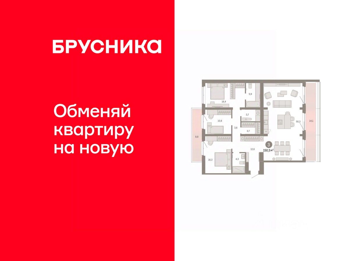 3-комн. квартира от застройщика с предчистовой отделкой в Кварталы ''На Минской'' на 6 этаже. Общая площадь: 150.53 кв.м. Высота потолков 2.7 м.