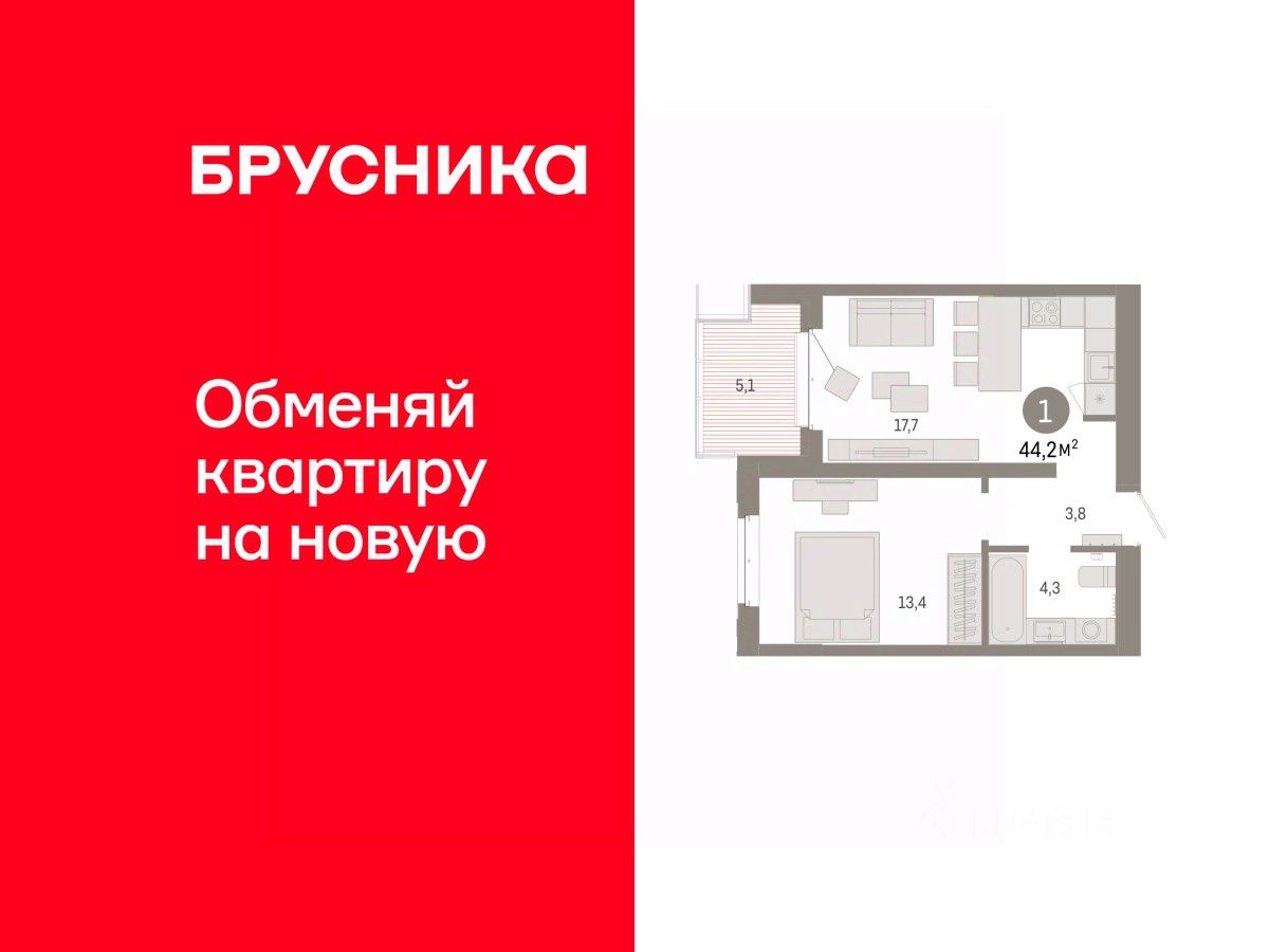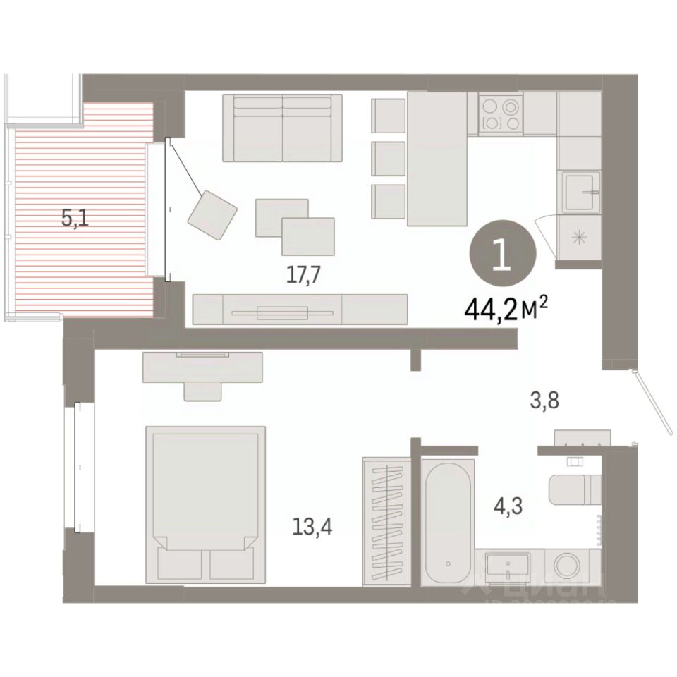 Квартира с кухней-гостиной и одной спальней в кварталах ''На Минской''. Особенности планировки: балкон, предчистовая отделка. квартиры в нашей базе: МНС02-Ж5.4.5.