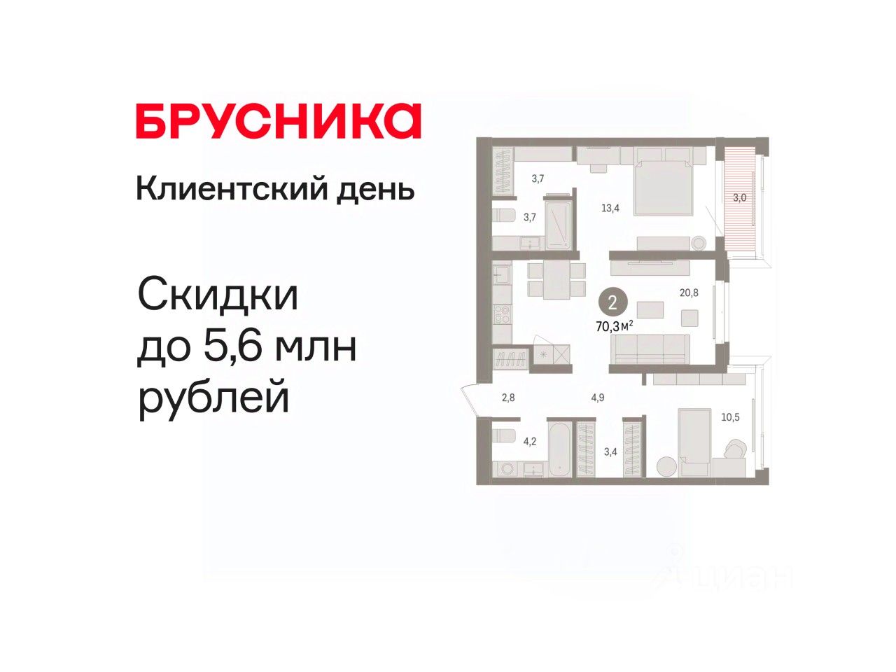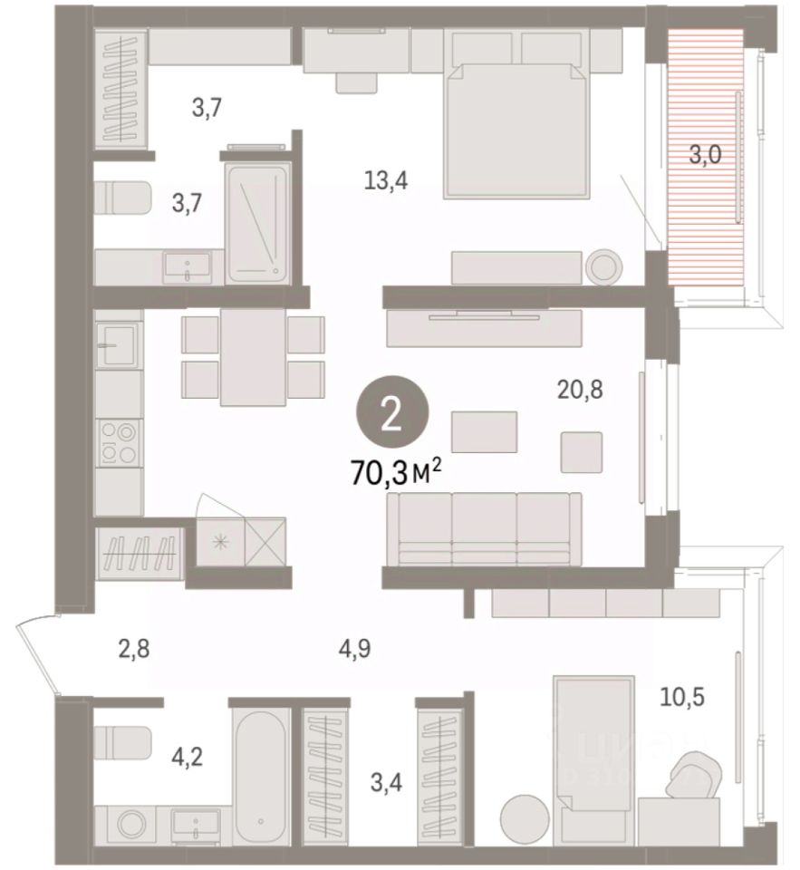 Квартира с кухней-гостиной и двумя спальнями в кварталах ''На Минской''. Особенности планировки: балкон, предчистовая отделка, разнесённые спальни. квартиры в нашей базе: МНС01-Ж2.4.5.