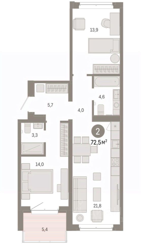 Квартира с кухней-гостиной и двумя спальнями в кварталах ''На Минской''. Особенности планировки: окна на две стороны, предчистовая отделка, разнесённые спальни. квартиры в нашей базе: МНС02-Ж4.4.1.
