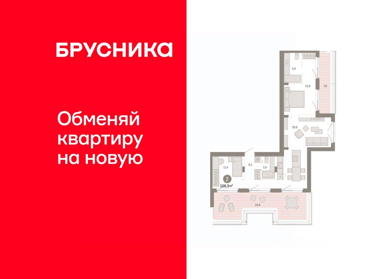 Квартира с кухней-гостиной и двумя спальнями в кварталах ''На Минской''. Особенности планировки: вид во двор, мастер-спальня, предчистовая отделка, разнесённые спальни, терраса на крыше. квартиры в нашей базе: МНС02-Ж2.7.2.