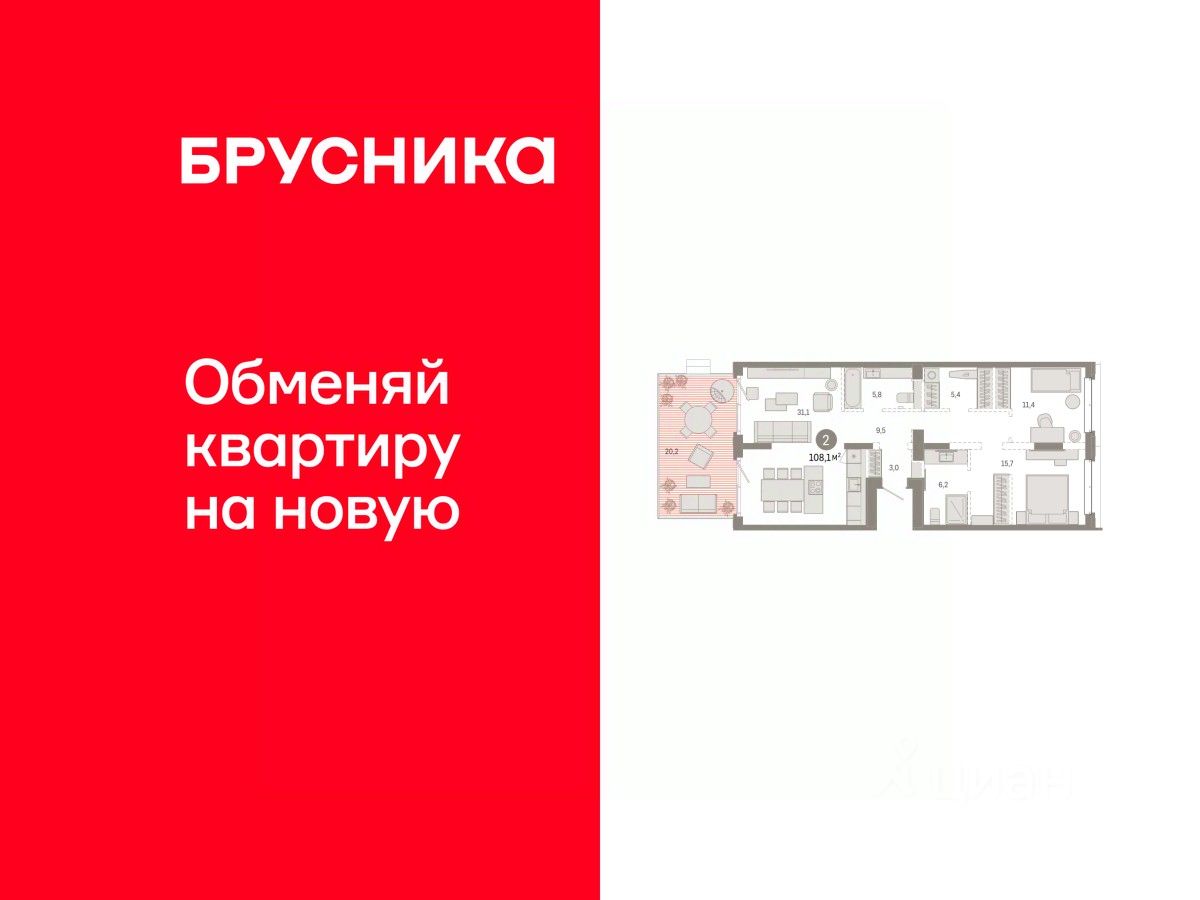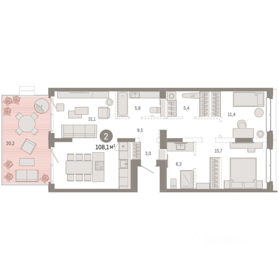 Квартира с кухней-гостиной и двумя спальнями в кварталах ''На Минской''. Особенности планировки: предчистовая отделка. квартиры в нашей базе: МНС02-Ж2.2.1.