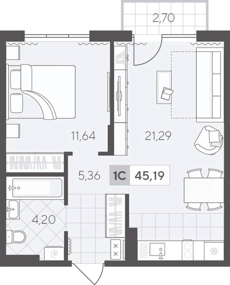 Уютная однокомнатная квартира 45.19 кв.м на 3 этаже. Функциональная планировка позволяет удобно организовать быт, а кухня-гостиная подойдёт для отдыха и общения.