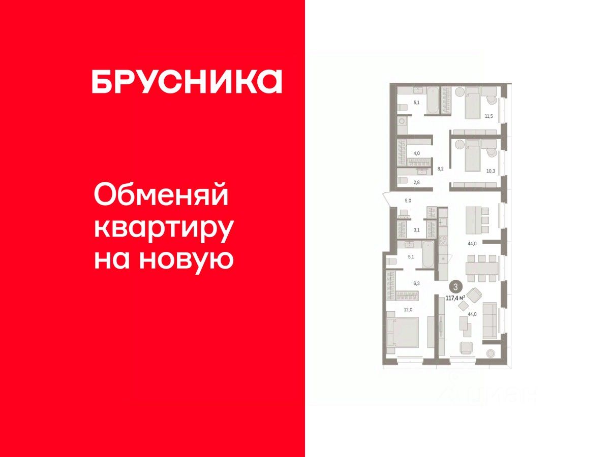 Квартира с кухней-гостиной и тремя спальнями в кварталах ''На Минской''. Особенности планировки: второй санузел, гардеробная, мастер-спальня, предчистовая отделка, разнесённые спальни. квартиры в нашей базе: МНС01-Ж3.2.2.