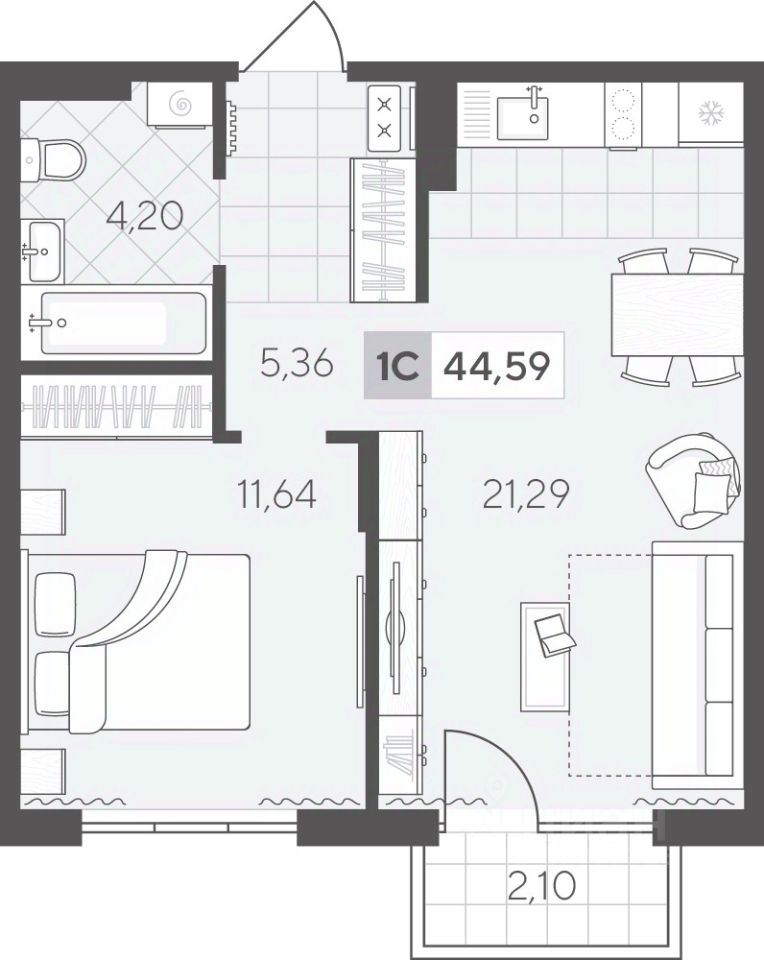Однокомнатная квартира 44.59 кв.м на 4 этаже с продуманной планировкой. Просторная кухня-гостиная идеально подходит для приёма гостей, а уютная спальня станет личным местом отдыха.