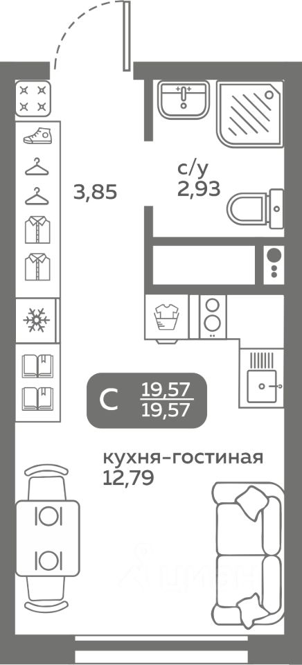 Прямая продажа от застройщика! Продается студия в строящемся ЖК ''Меридиан Слобода'', срок сдачи: I-кв. 2027, общей площадью 19.57 м², на 15 этаже из 20. Площадь кухни — 12.79 м².