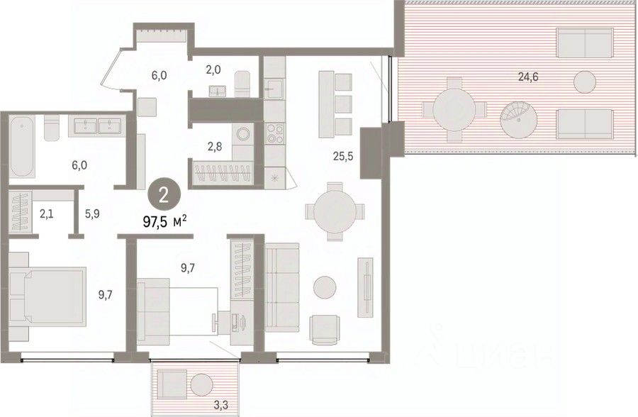 Квартира с кухней-гостиной и двумя спальнями в жилом районе ''Речной порт''. Особенности планировки: предчистовая отделка, разнесённые спальни, терраса на крыше. квартиры в нашей базе: РП-09--2-2.5.2.