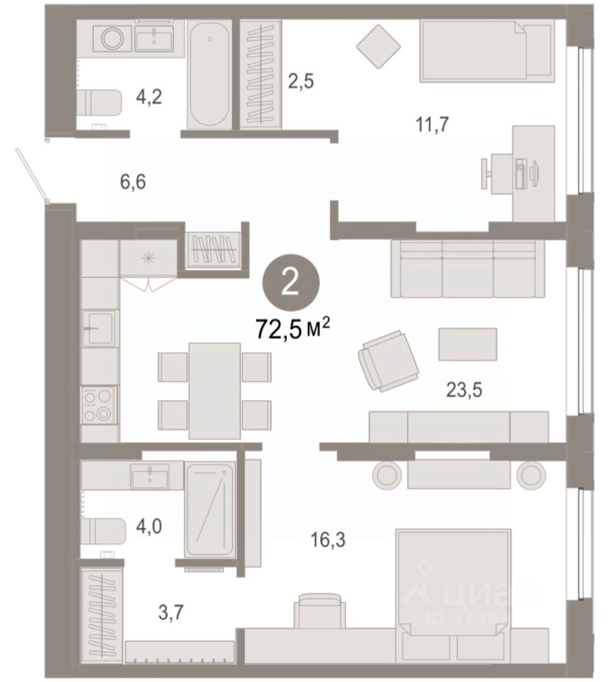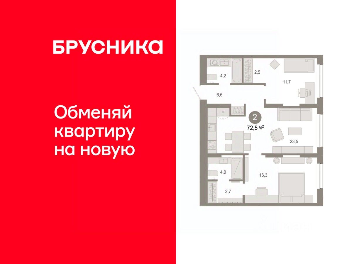 Квартира с кухней-гостиной и двумя спальнями в Октябрьском на Туре. Особенности планировки: вид во двор, гардеробная, мастер-спальня, предчистовая отделка, разнесённые спальни. квартиры в нашей базе: ОКТ09-Ж1.2.2.