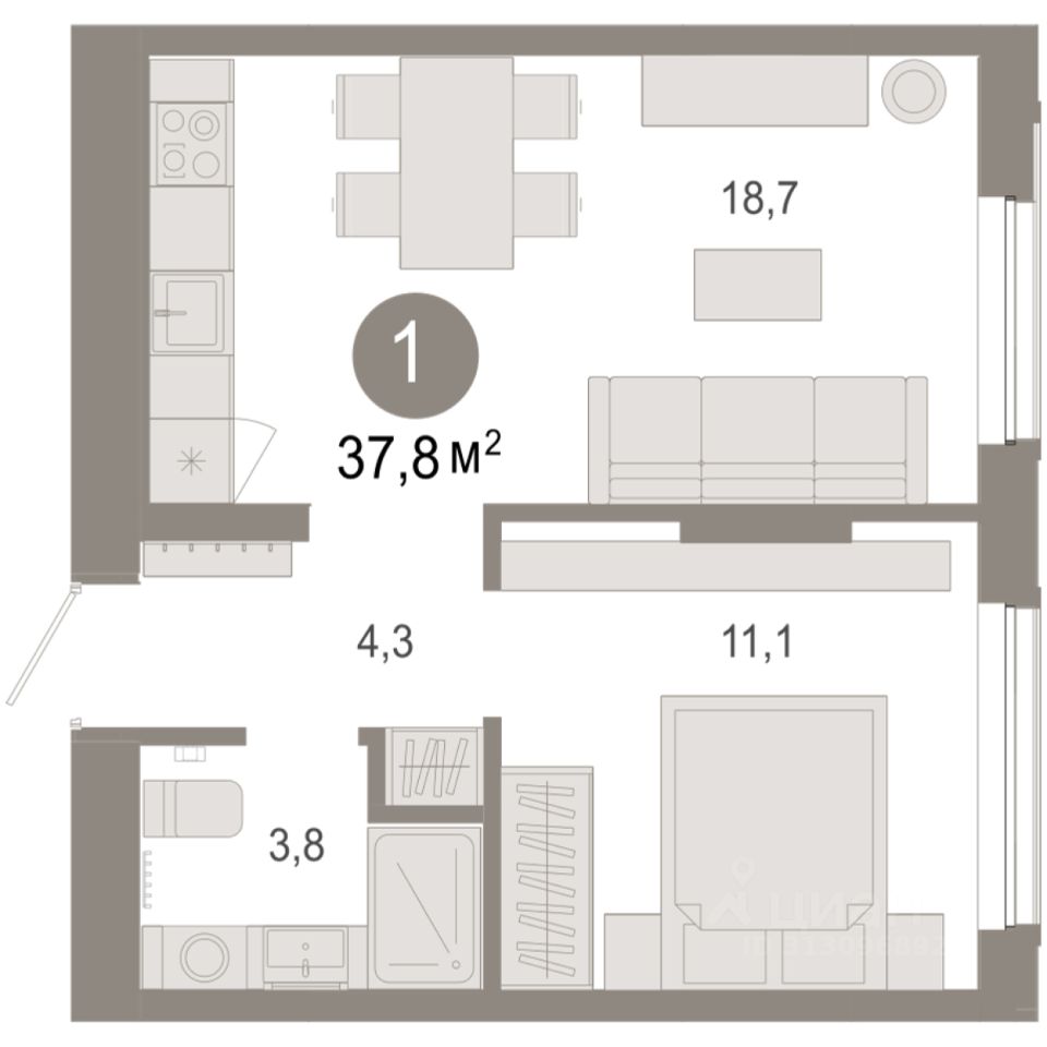 Квартира с кухней-гостиной и одной спальней в Октябрьском на Туре. Особенности планировки: предчистовая отделка. квартиры в нашей базе: ОКТ09-Ж5.2.2.