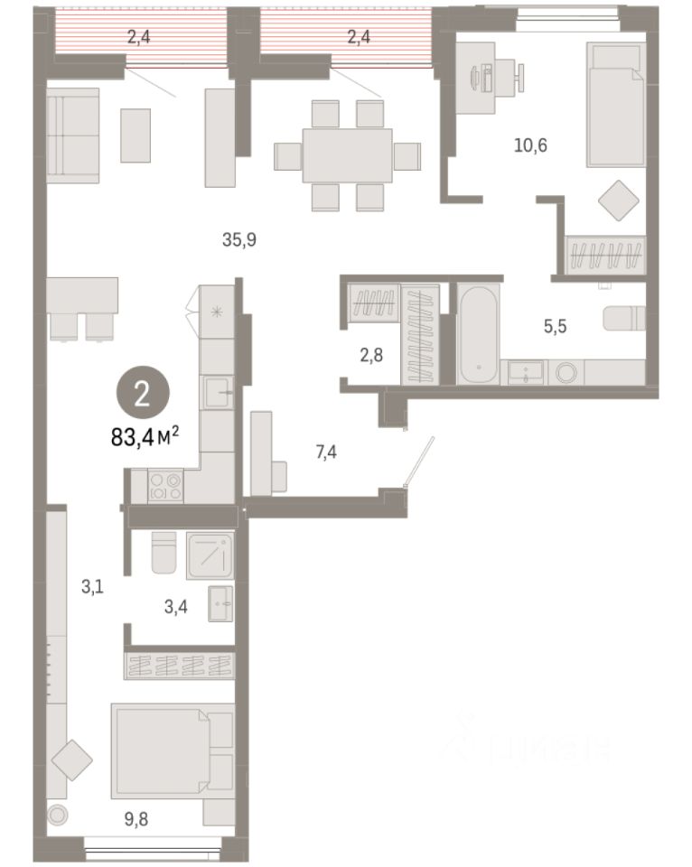 Квартира с кухней-гостиной и двумя спальнями в Октябрьском на Туре. Особенности планировки: предчистовая отделка, разнесённые спальни. квартиры в нашей базе: ОКТ-08-1-1.6.2.
