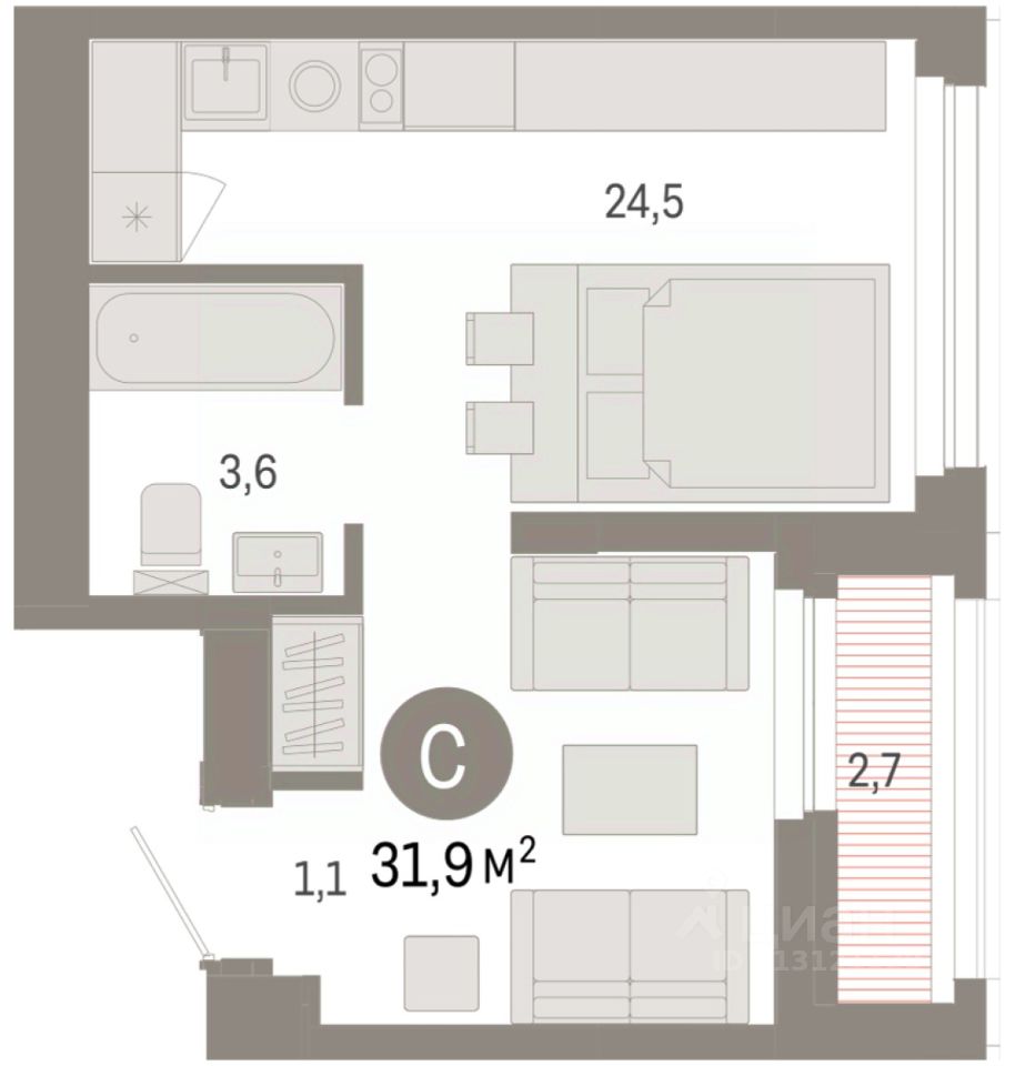 Просторная 1-комн. студия с предчистовой отделкой в ЖК ''Зарека'' на 13 этаже. Общая площадь: 31.49 кв.м., площадь гостиной 24.5 кв.м., из которых 10 кв.м. выделено под кухонную зону. Все окна выходят на одну сторону. В квартире одна лоджия, один совмещенный санузел. Высота потолков 2.7 м.