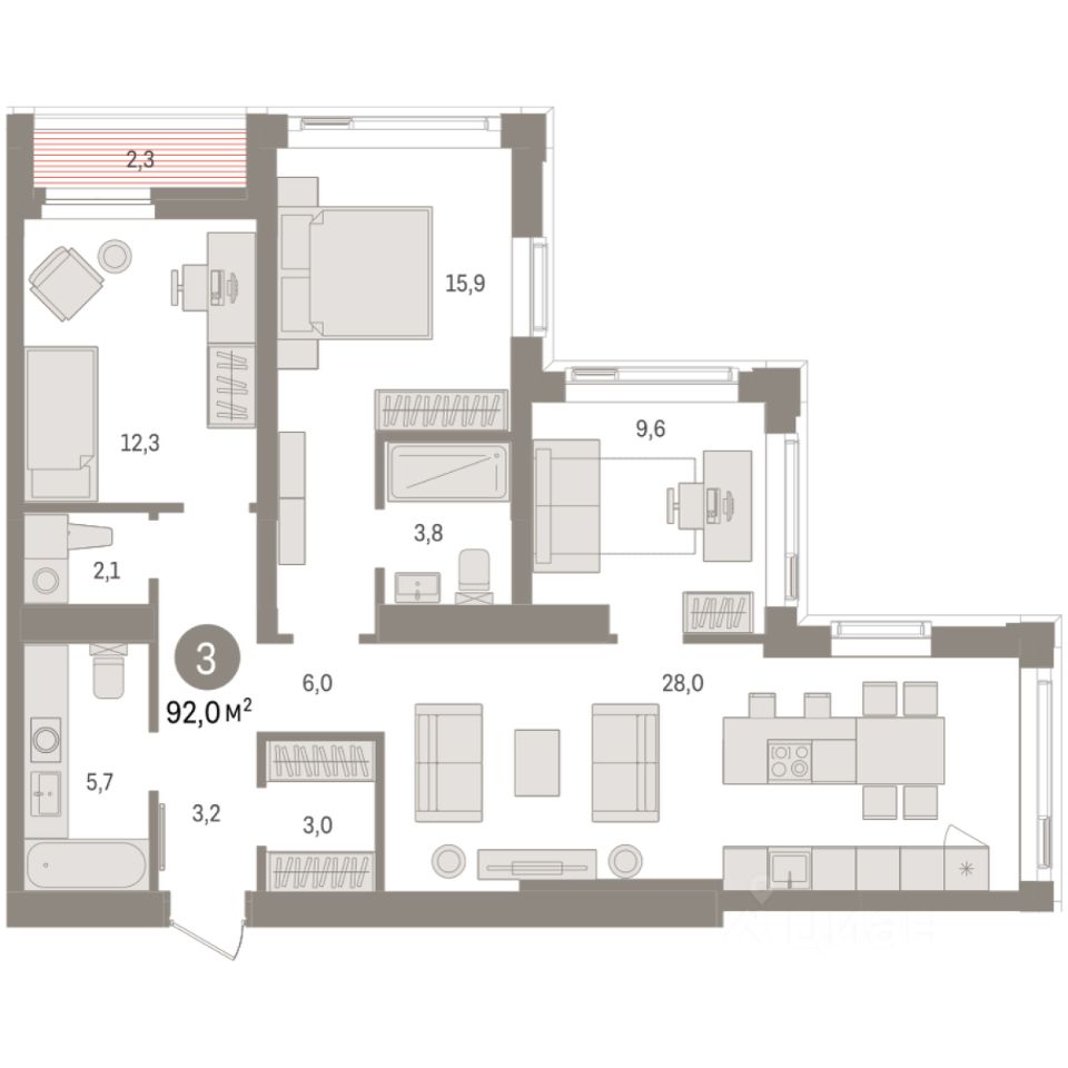 3-комн. квартира с предчистовой отделкой в ЖК ''Зарека'' на 21 этаже. Общая площадь: 92.02 кв.м. Высота потолков 2.7 м.