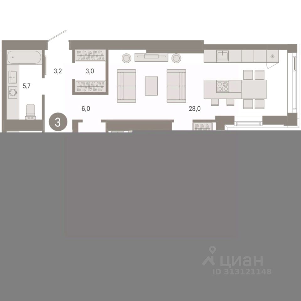 Продаётся с паркингом. Квартира с кухней-гостиной и тремя спальнями в жилом районе ''Зарека''. Особенности планировки: предчистовая отделка, терраса на крыше. квартиры в нашей базе: ЗРК05.1-Ж1.21.1.