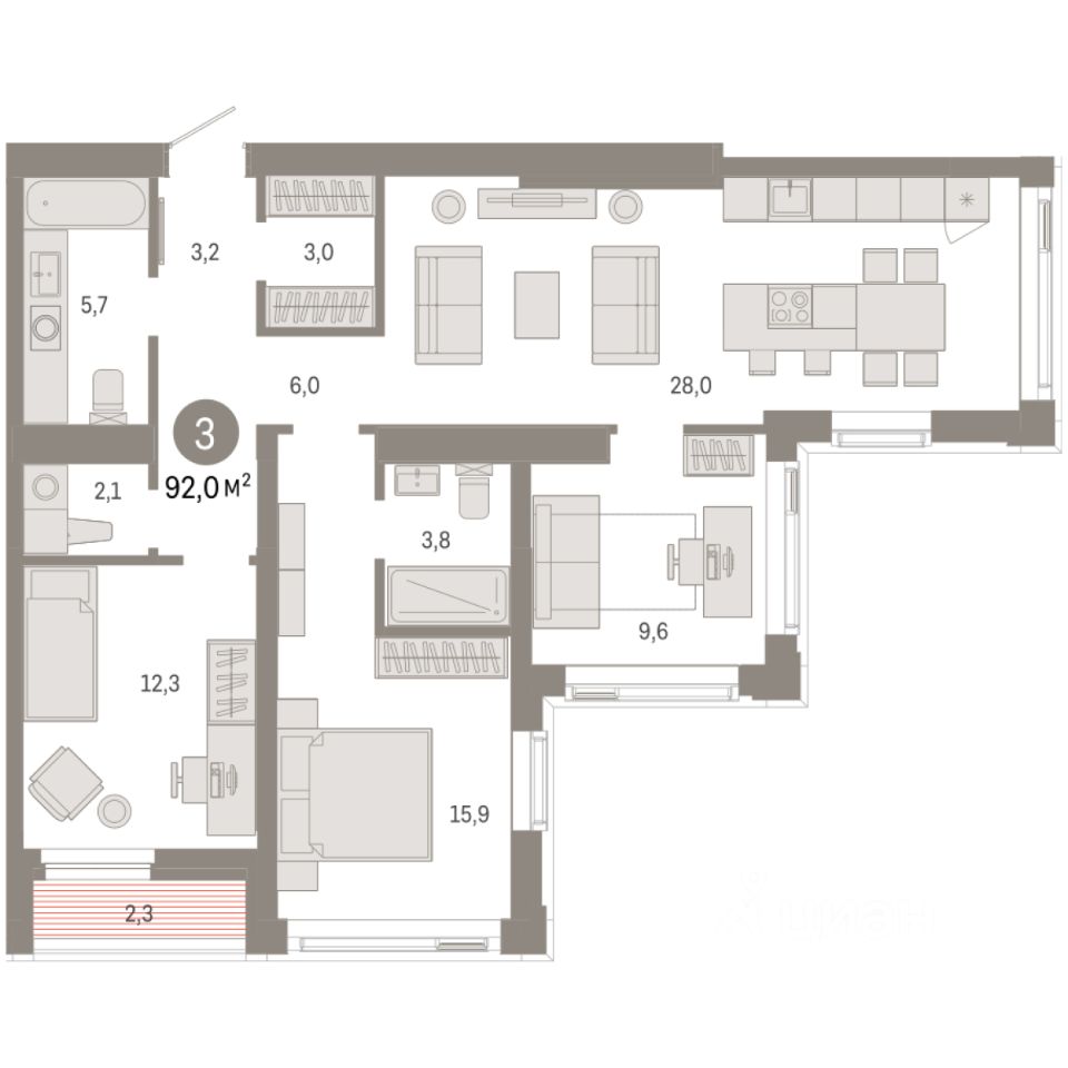 Трехкомнатная квартира с предчистовой отделкой в ЖК ''Зарека'' на 21 этаже. Общая площадь: 92.01 кв.м. Высота потолков 2.7 м.