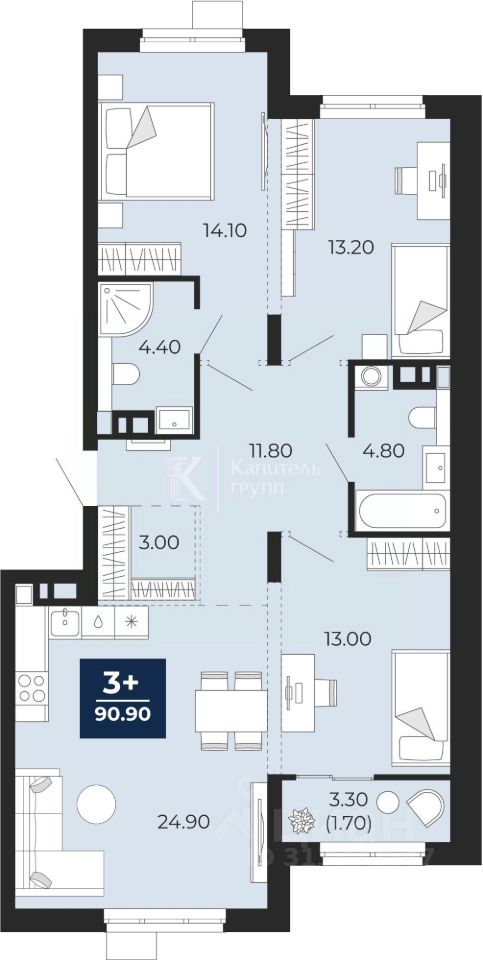 id:35133. Продаётся квартира формата 3+ площадью 91 м в жилом комплексе ''Айвазовский''. Окна выходят на две стороны, с 11 этажа открывается прекрасный вид. Во дворе располагается современный детский сад для жителей ''Айвазовского''. Уникальный проект отмечен на федеральных архитектурных выставках.
