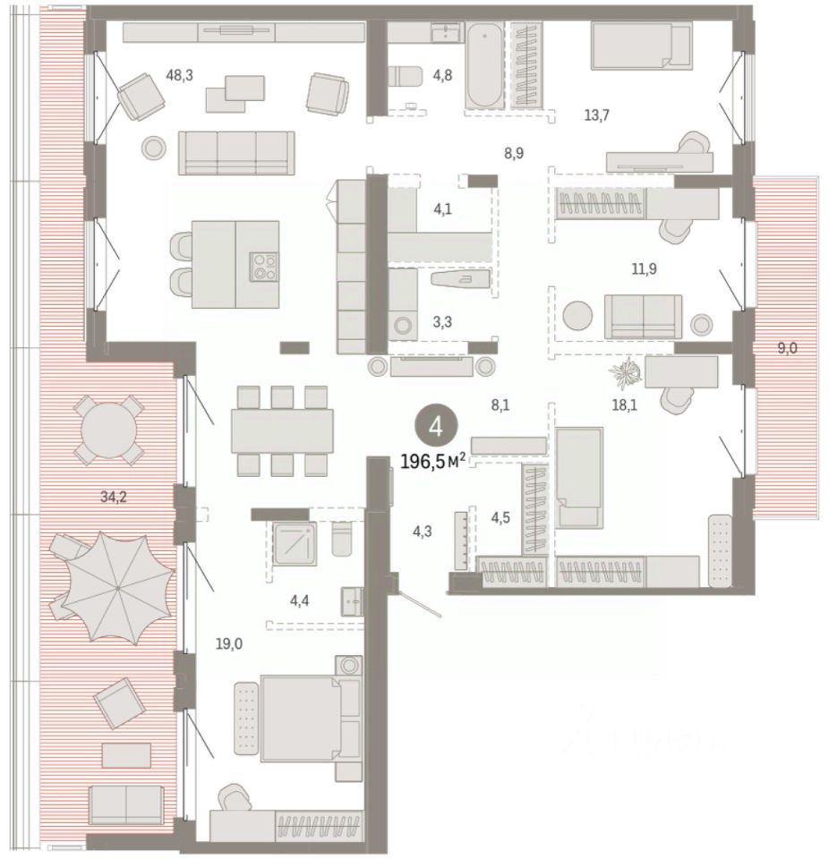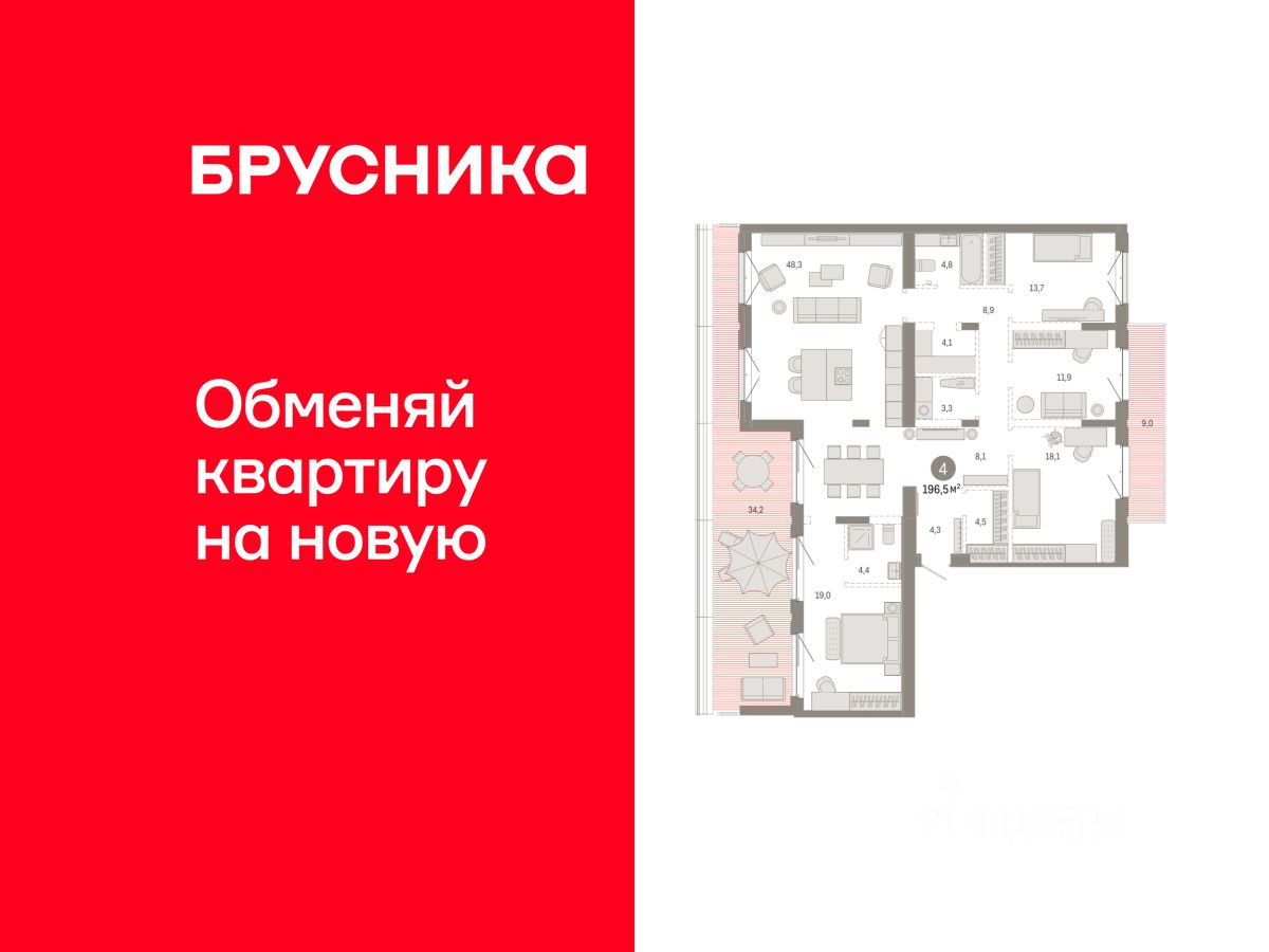 Квартира с кухней-гостиной и четырьмя спальнями в кварталах ''На Минской''. Особенности планировки: балкон, вид во двор, гардеробная, мастер-спальня, окна в пол, постирочная, потолки 3 м и выше, предчистовая отделка, рабочий кабинет, разнесённые спальни, терраса на крыше. квартиры в нашей базе: МНС02-Ж8.7.2.