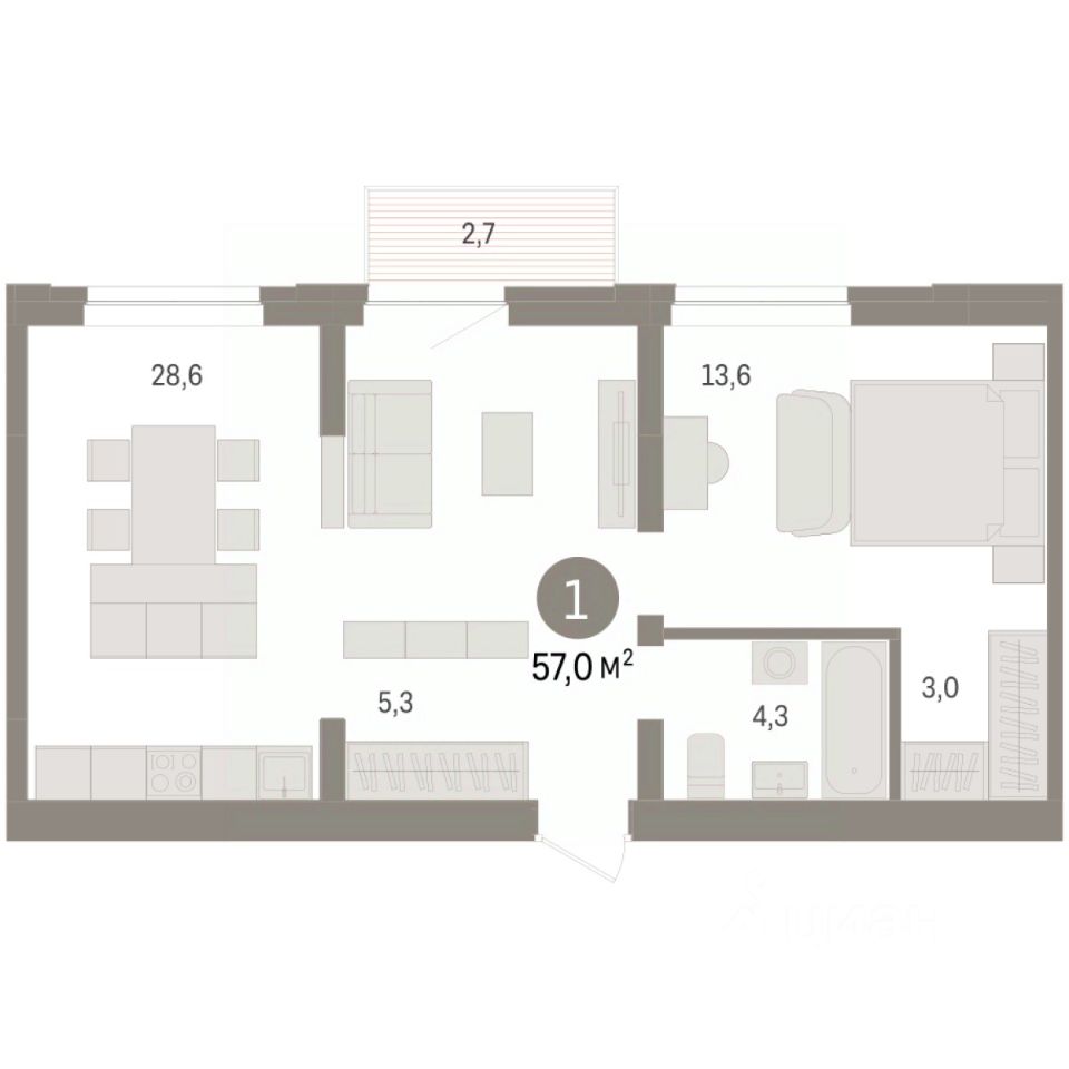 Квартира с кухней-гостиной и одной спальней в жилом районе ''Речной порт''. Особенности планировки: балкон, предчистовая отделка. квартиры в нашей базе: РПТ04-Ж3.8.9.