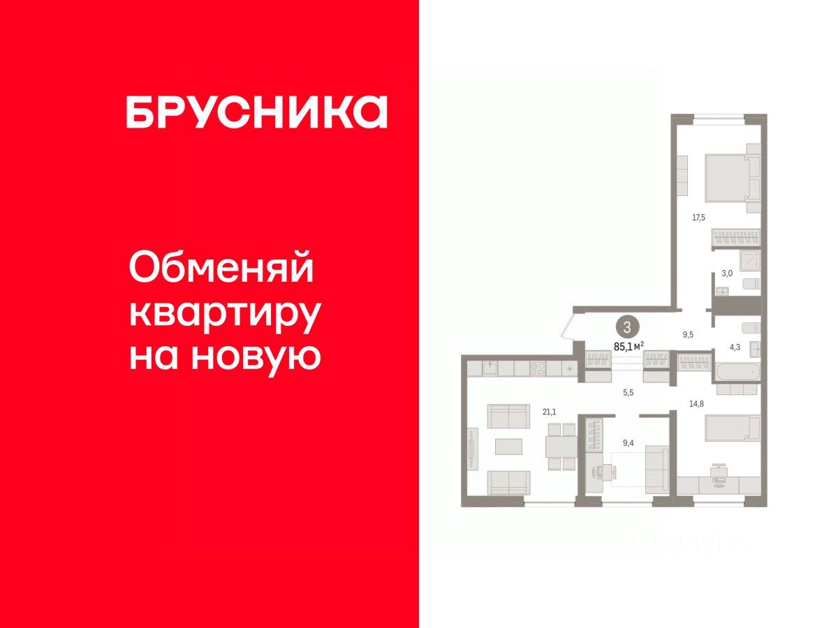 Квартира с кухней-гостиной и тремя спальнями в жилом районе ''Речной порт''. Особенности планировки: вид во двор, мастер-спальня, предчистовая отделка, разнесённые спальни. квартиры в нашей базе: РПТ04-Ж7.3.4.