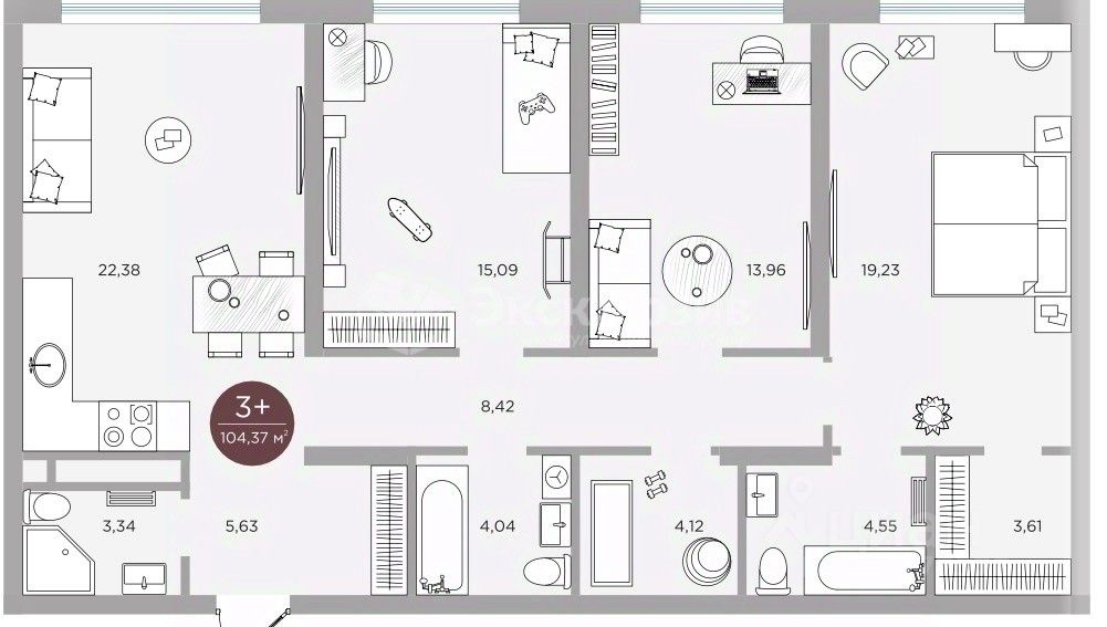 Продажа трехкомнатной квартиры 103 кв метров на 10 этаже с панорамным видом. улучшенная черновая отделка в центре Тюмени. Три санузла. кухня-гостиная 22 кв.метров. лоджия 5 кв.метров с витражным остеклением. мастер-спальня. гардеробная, высота потолков 3,3 метра. с окном в ванной комнате.