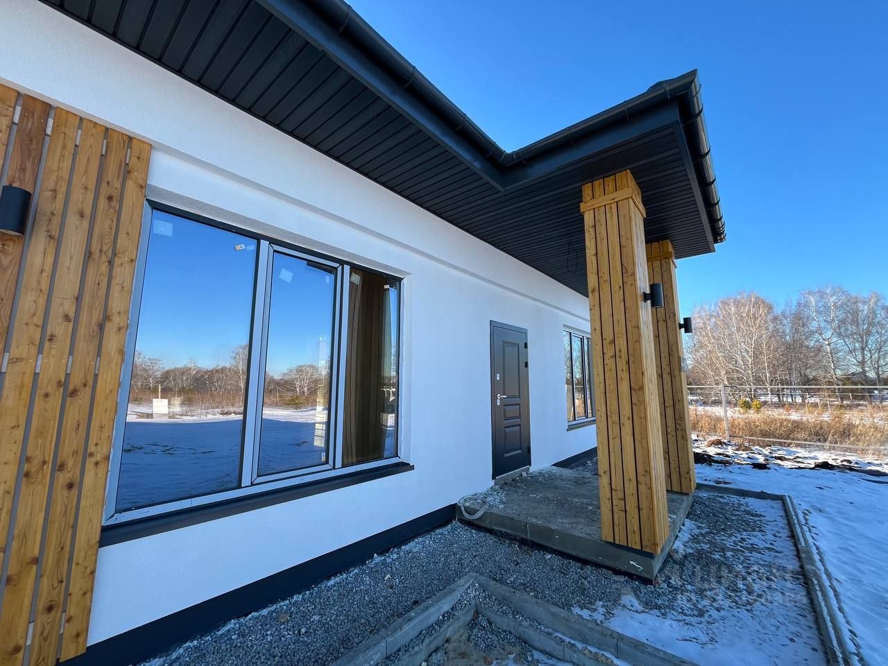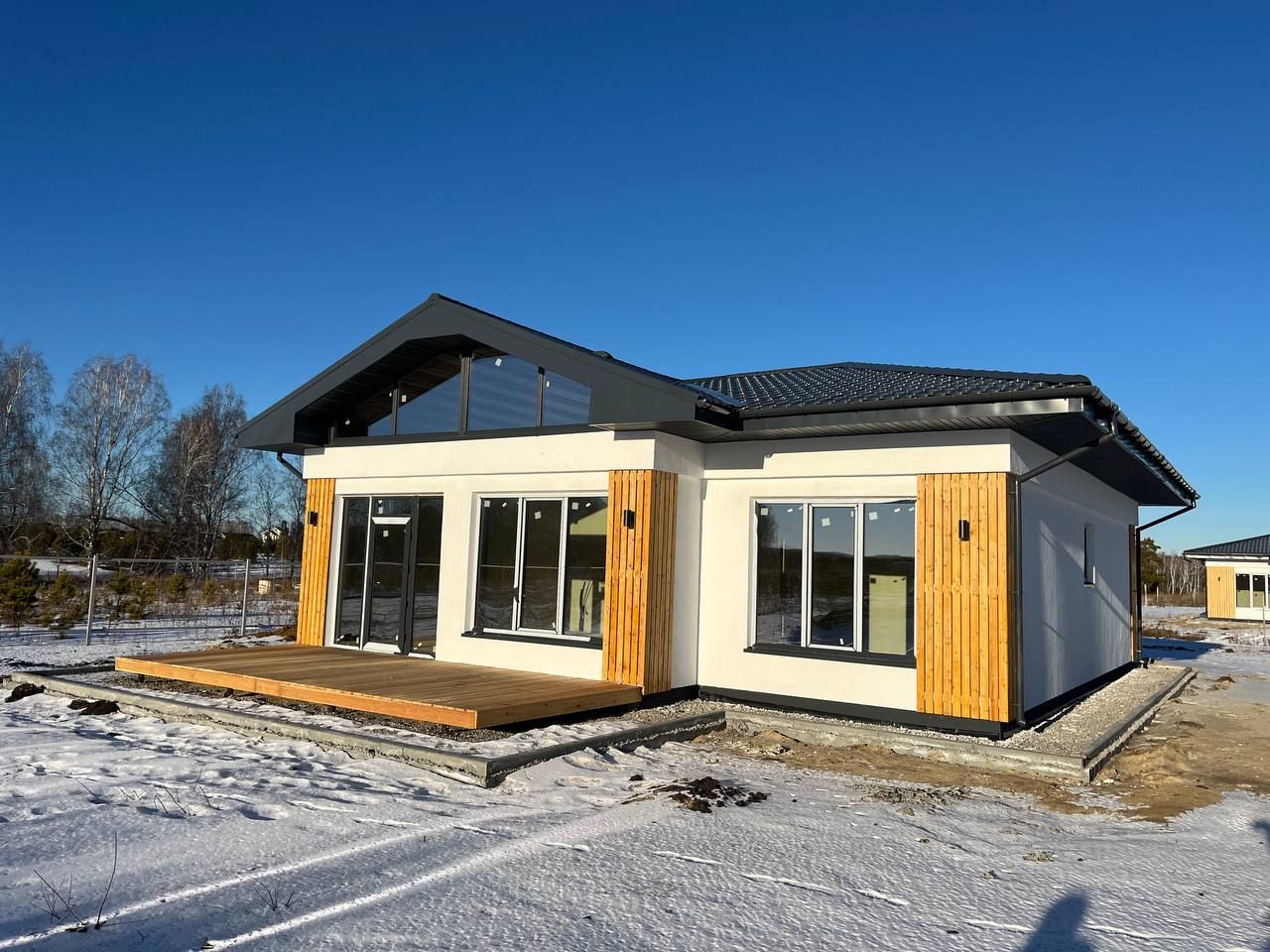 - Эстетика и защита: - Утепленная отмостка защищает фундамент от промерзания. - Фасадная штукатурка придает дому стильный и аккуратный вид.