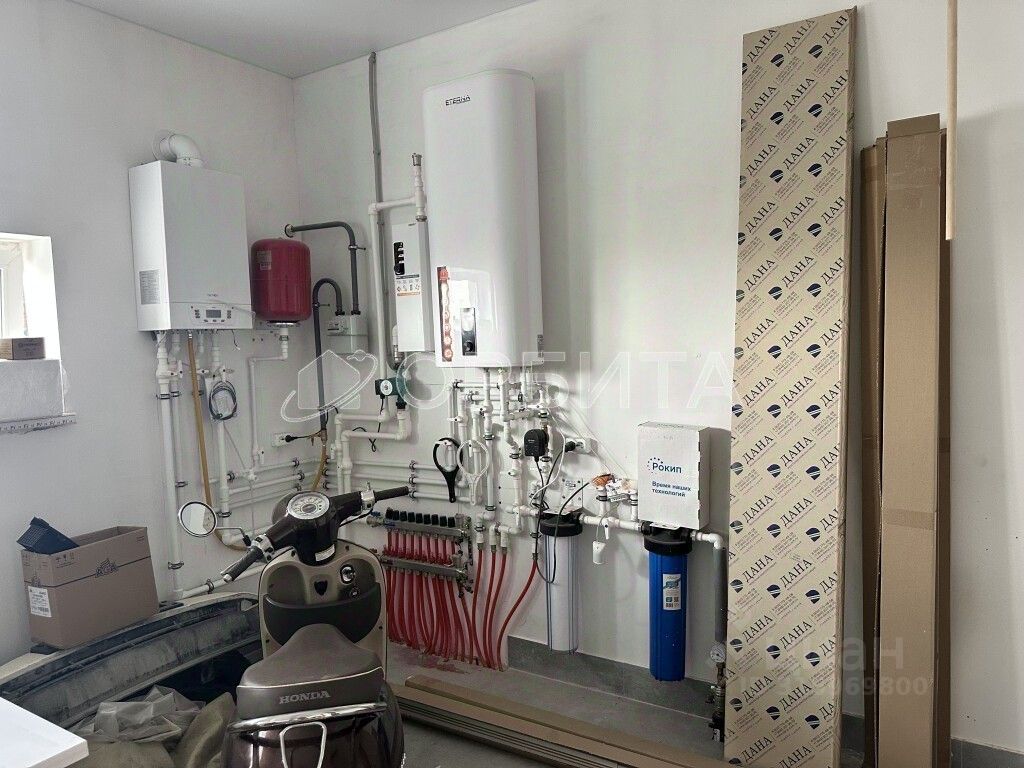 Заведены в дом центральный водопровод, газ (установлен газовый котел), электричество, установлен переливной септик.