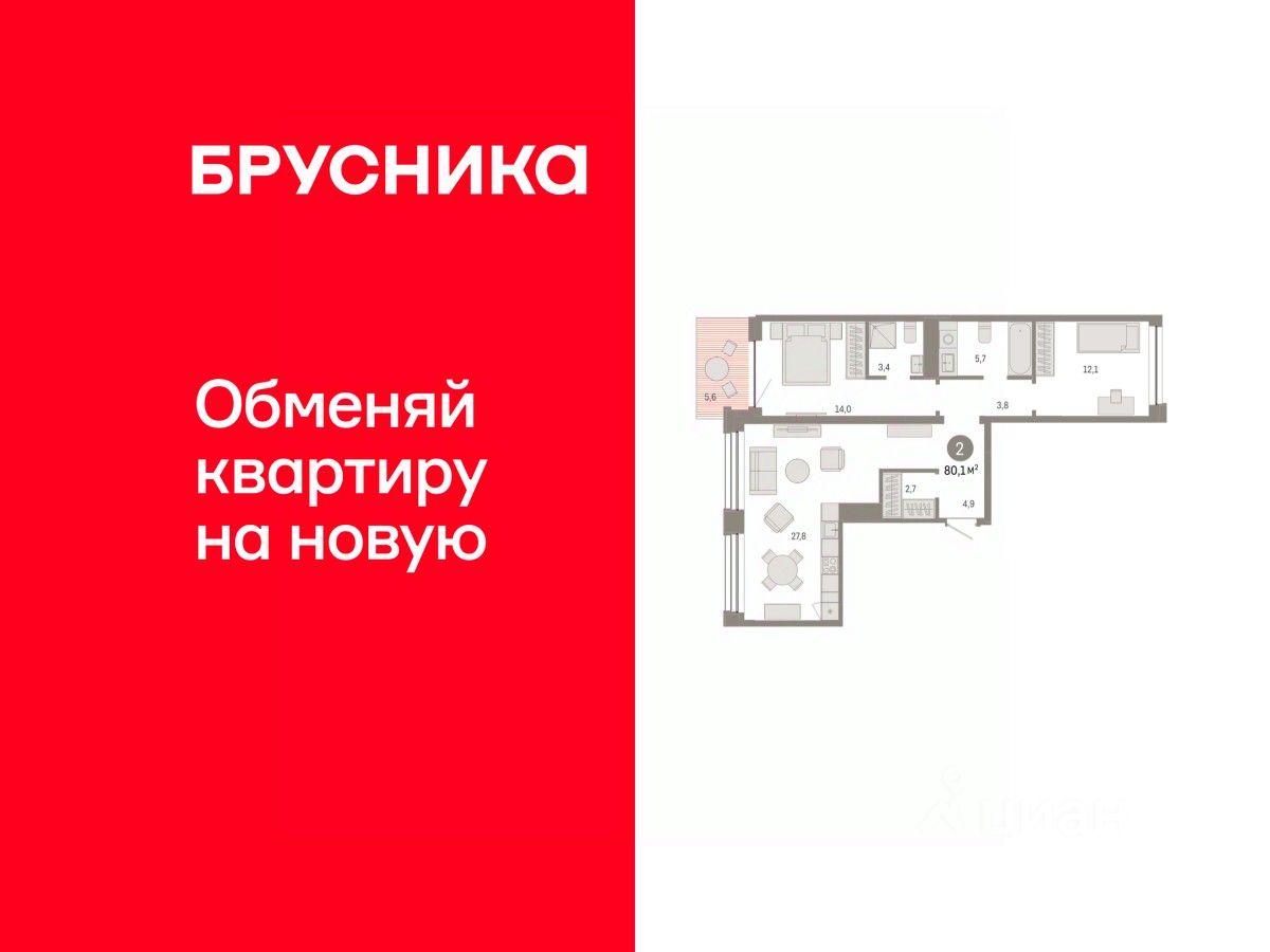 2-комн. квартира от застройщика с предчистовой отделкой в ЖК ''Дом у озера'' на 5 этаже. Общая площадь: 80.09 кв.м., жилая: 26.1 кв.м., площадь просторной кухни-гостиной: 27.8 кв.м. Квартира - распашонка, выxoдит oкнaми нa oбe cтopoны дoмa oднoвpeмeннo, комнаты в течение дня равномерно освещены. В квартире один балкон, два совмещенных санузла. Высота потолков 2.7 м.
